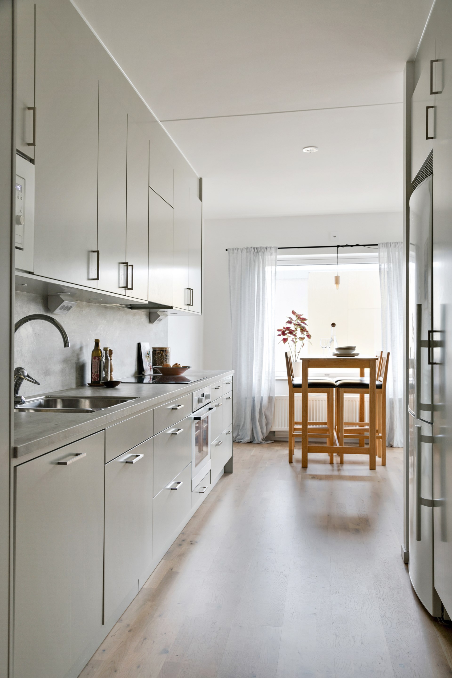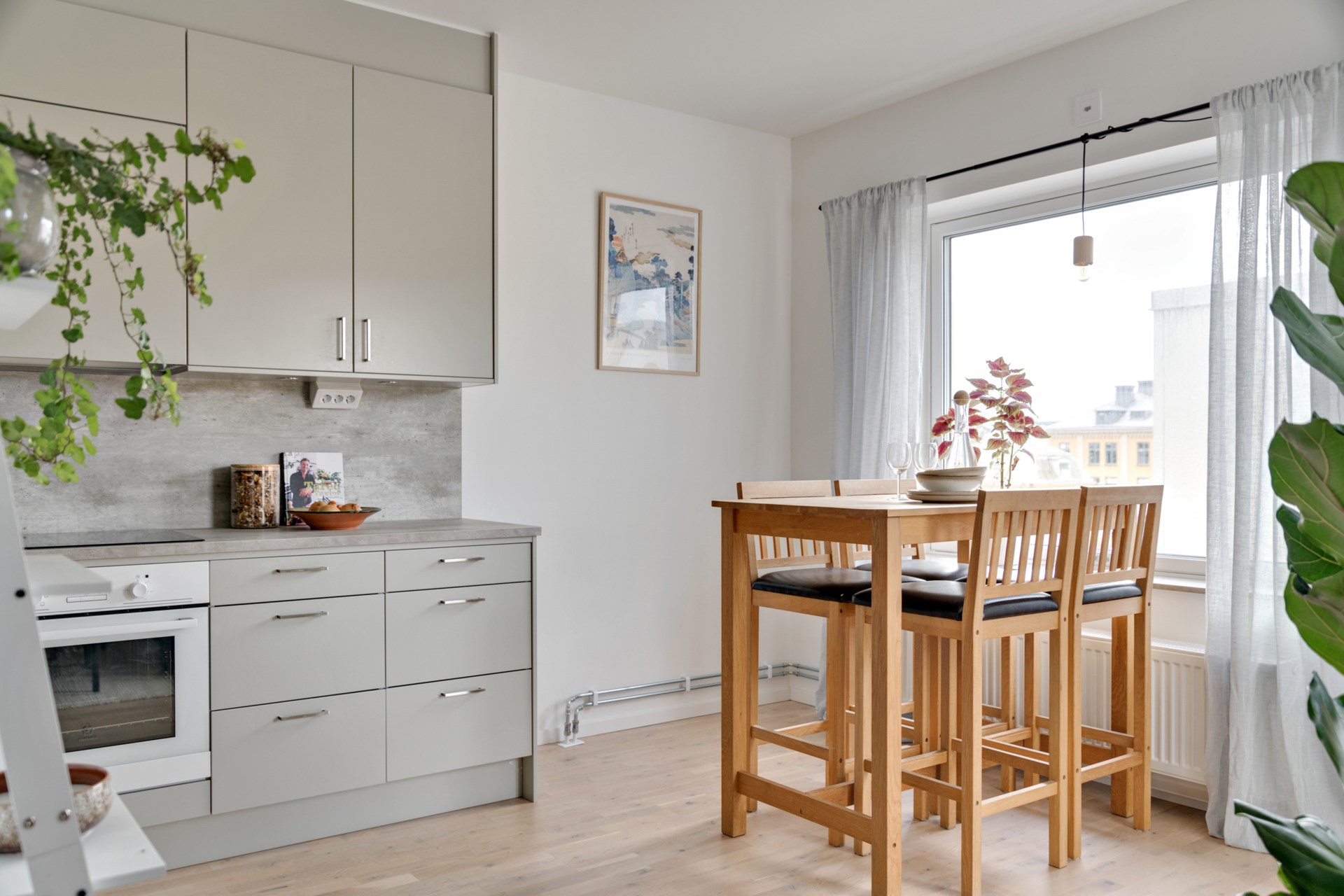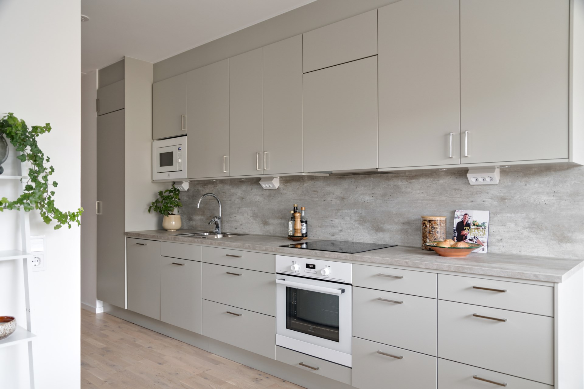 • Kök: Stilrena köksluckor från Vedum, integrerad diskmaskin, exklusiv induktionshäll med fläktkåpa, vackra bänkskivor, inbyggnadsugn och micro. Kombinerad kyl/frys. Köket går i en vacker varmgrå nyans. Här ryms plats för ett matbord. Från köket har man utgång till balkongen.