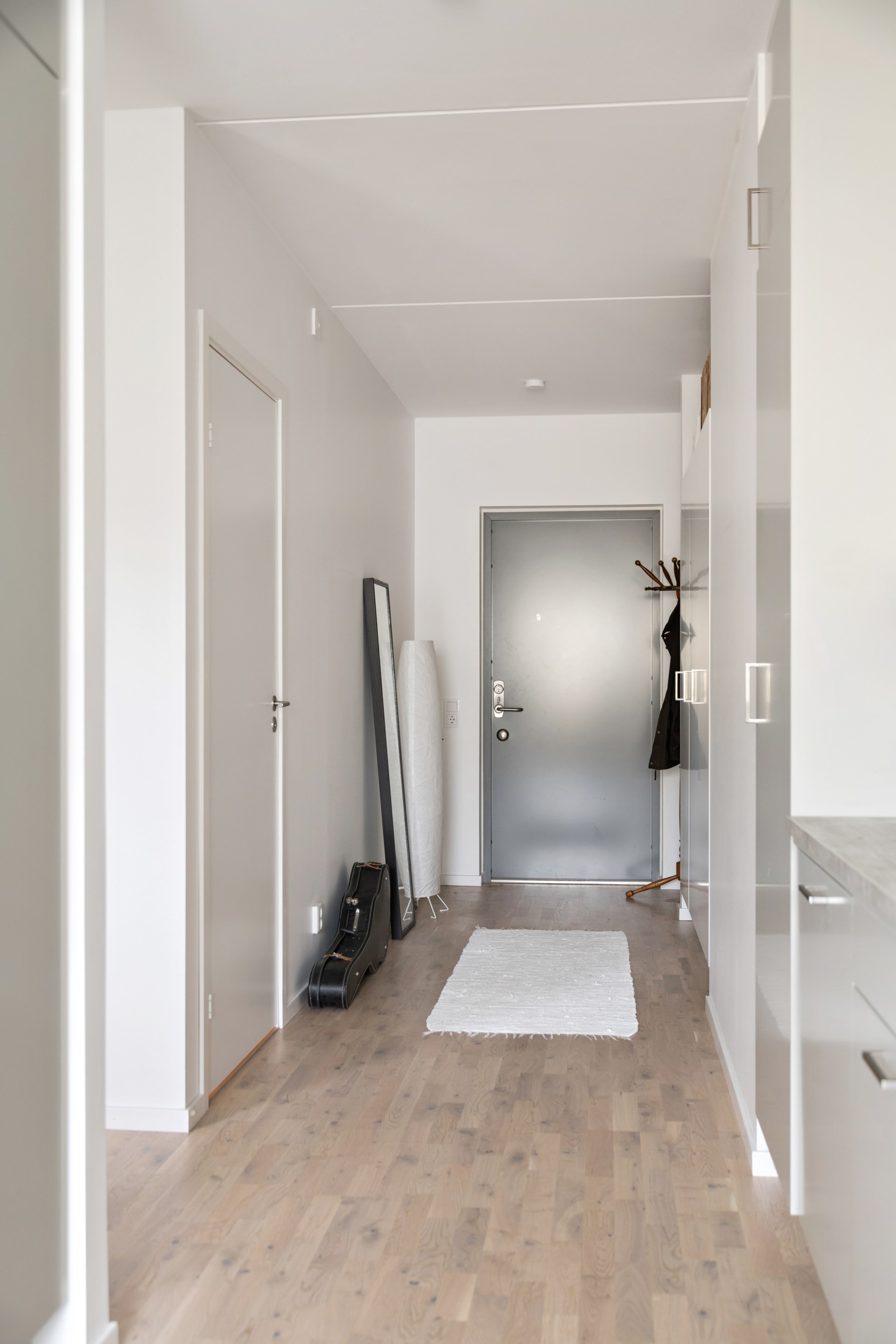 • Hall: Välkomnande hall med stora möjligheter till förvaring iform av väggfasta garderober. Vackert trägolv som är genomgående i hela lägenheten.
