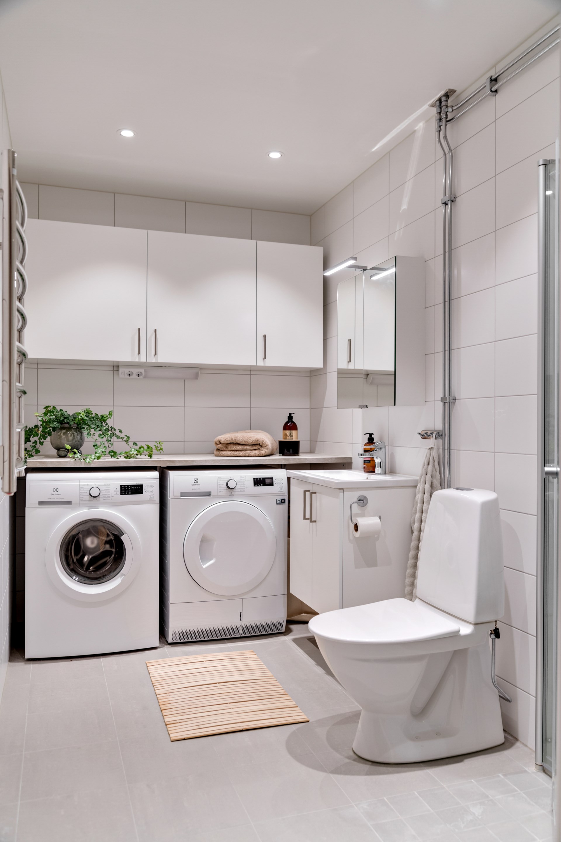 • Badrum: Från hallen stiger man i ett rymligt badrum, med stilrent kakel/klinker och spotlights i taket. Duschdörrar i glas, kommod, wc, och handdukstork. I badrummet finns även tvättmaskin, torktumlare och gott om plats till förvaring.
