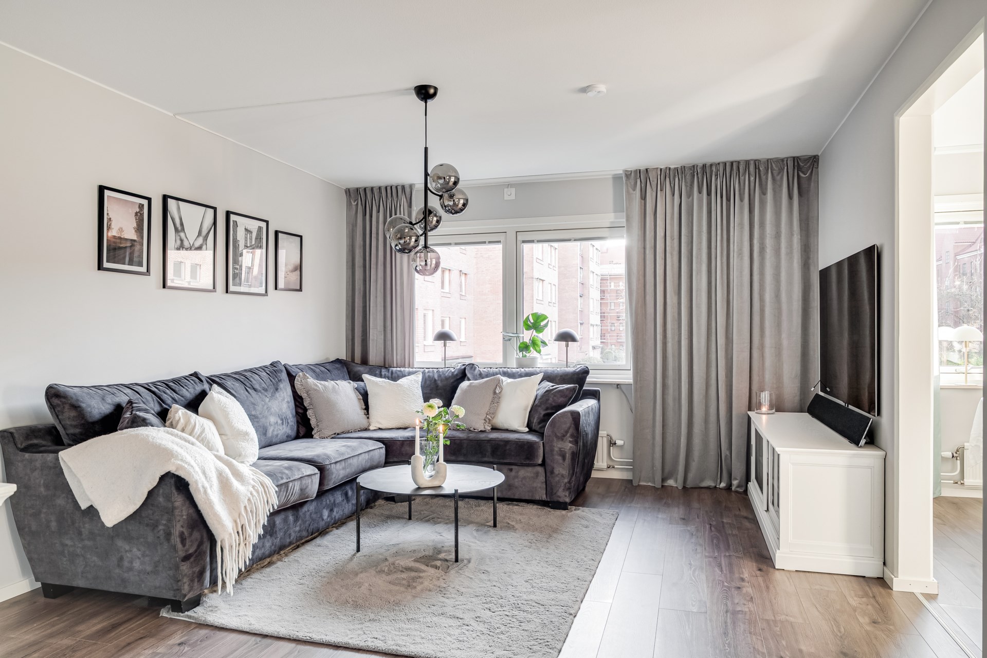 När du kliver in möts du av en inbjudande och rymlig hall med gott om plats för ytterkläder och förvaring i generösa garderober. Vidare in öppnar lägenheten upp sig mot ett ljust och luftigt vardagsrum med stora fönsterpartier som släpper in härligt dagsljus.