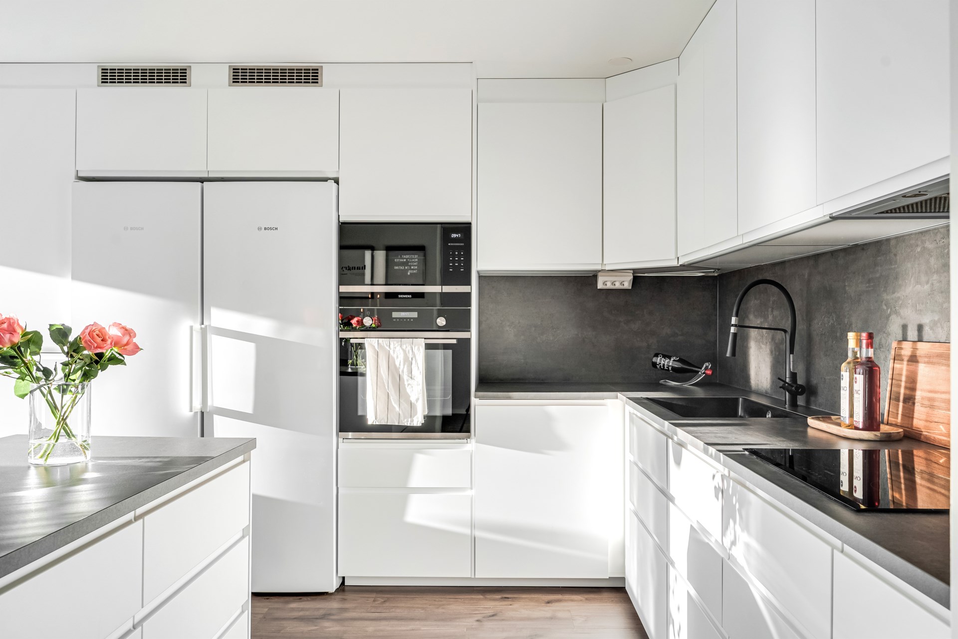 Det stilrena köket, som renoverades 2023, är en riktig höjdpunkt – här kombineras design och funktion på bästa sätt. Med stora arbetsytor, rikligt med förvaring, fullstor kyl och frys, diskmaskin samt en inbjudande köksö blir detta en naturlig samlingsplats för både vardag och fest. Här finns även plats för ett större matbord.