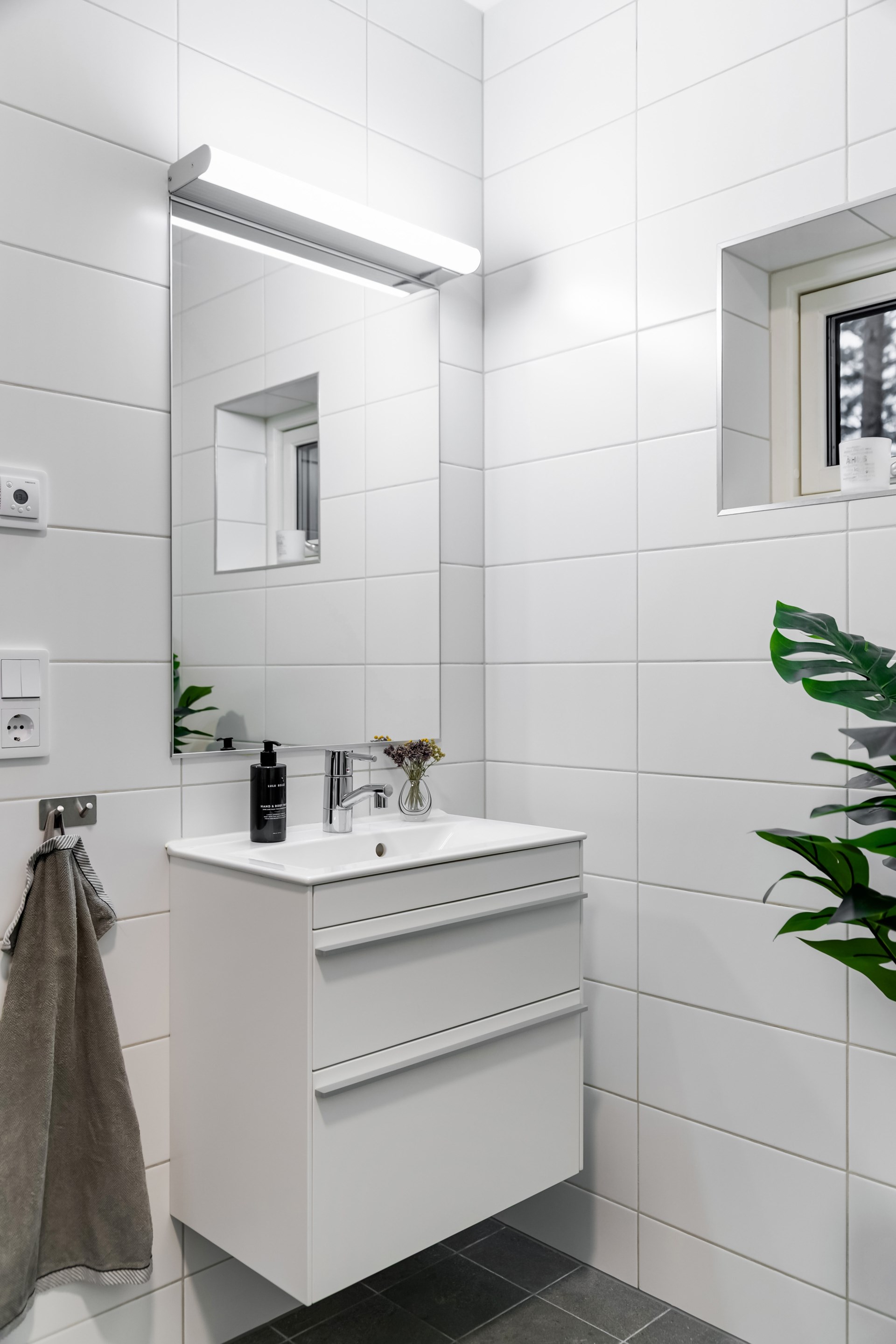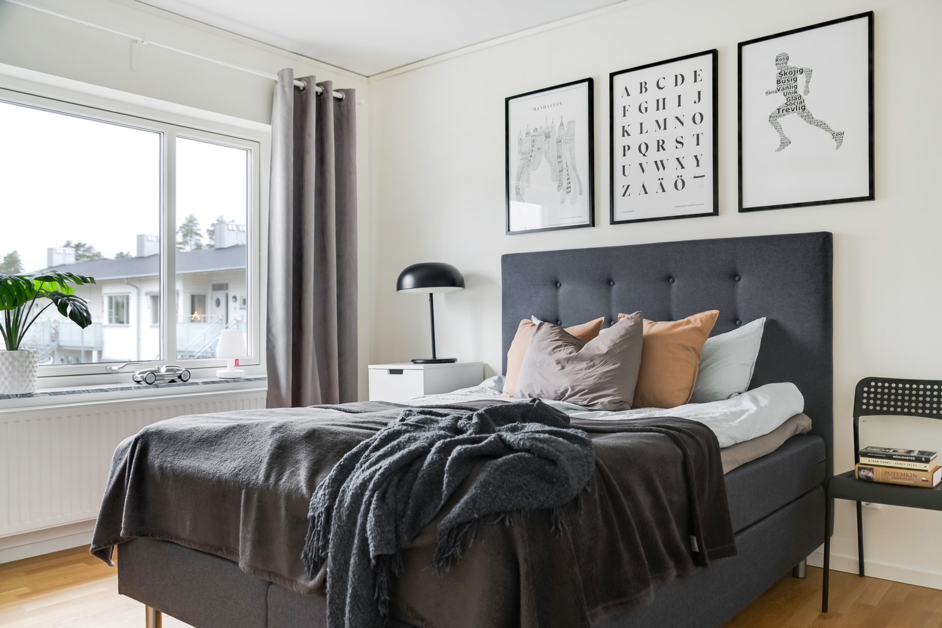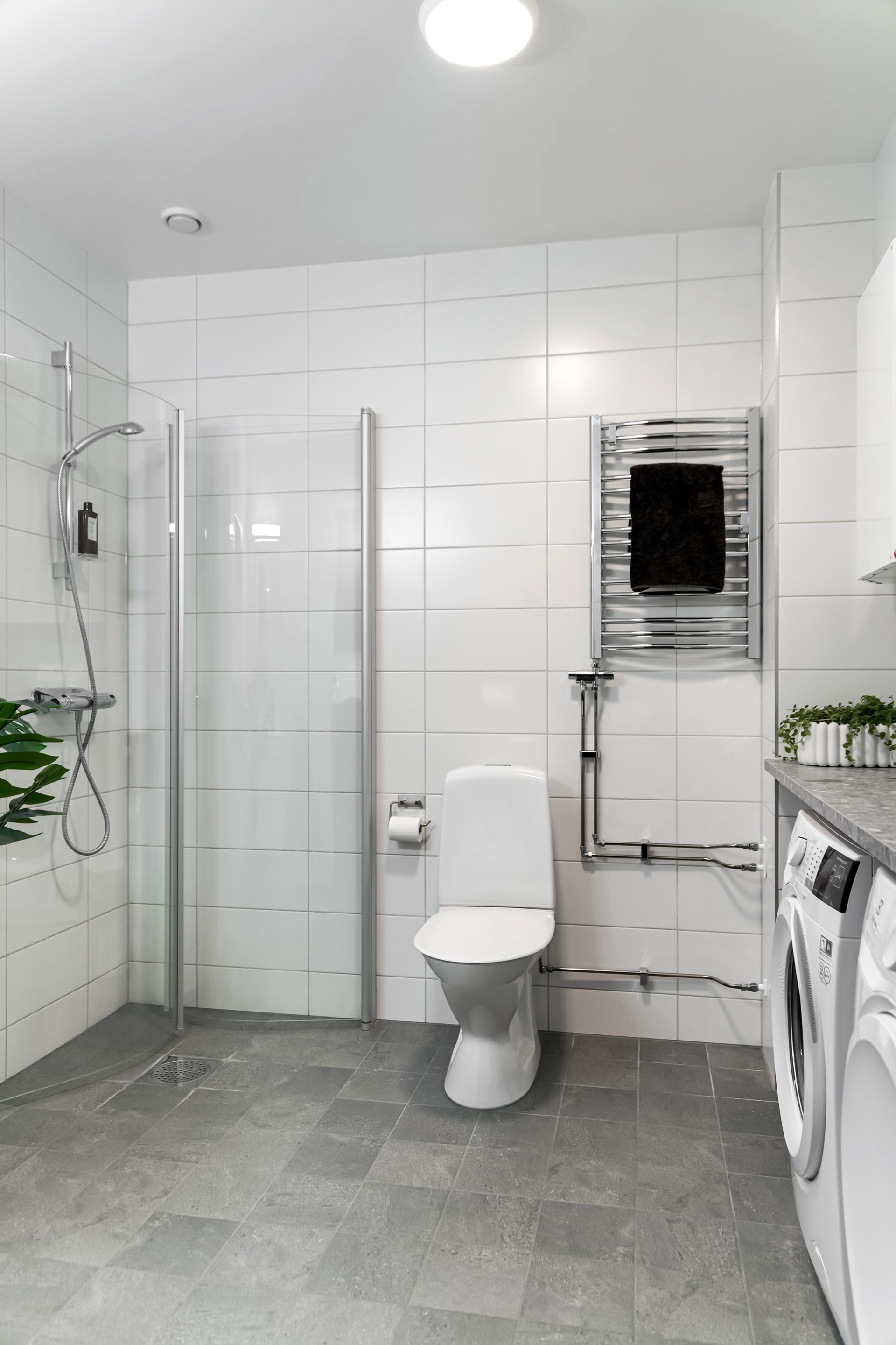 Det helkaklade badrummet erbjuder både stil och komfort med klinkergolv, (golvvärme) duschväggar i glas, elektrisk handdukstork samt egen tvättdel utrustad med tvättmaskin och torktumlare. Lägenhetens sovrum bjuder på en stor garderobsvägg med vackert trägolv, vilket är enhetligt i hela lägenheten.