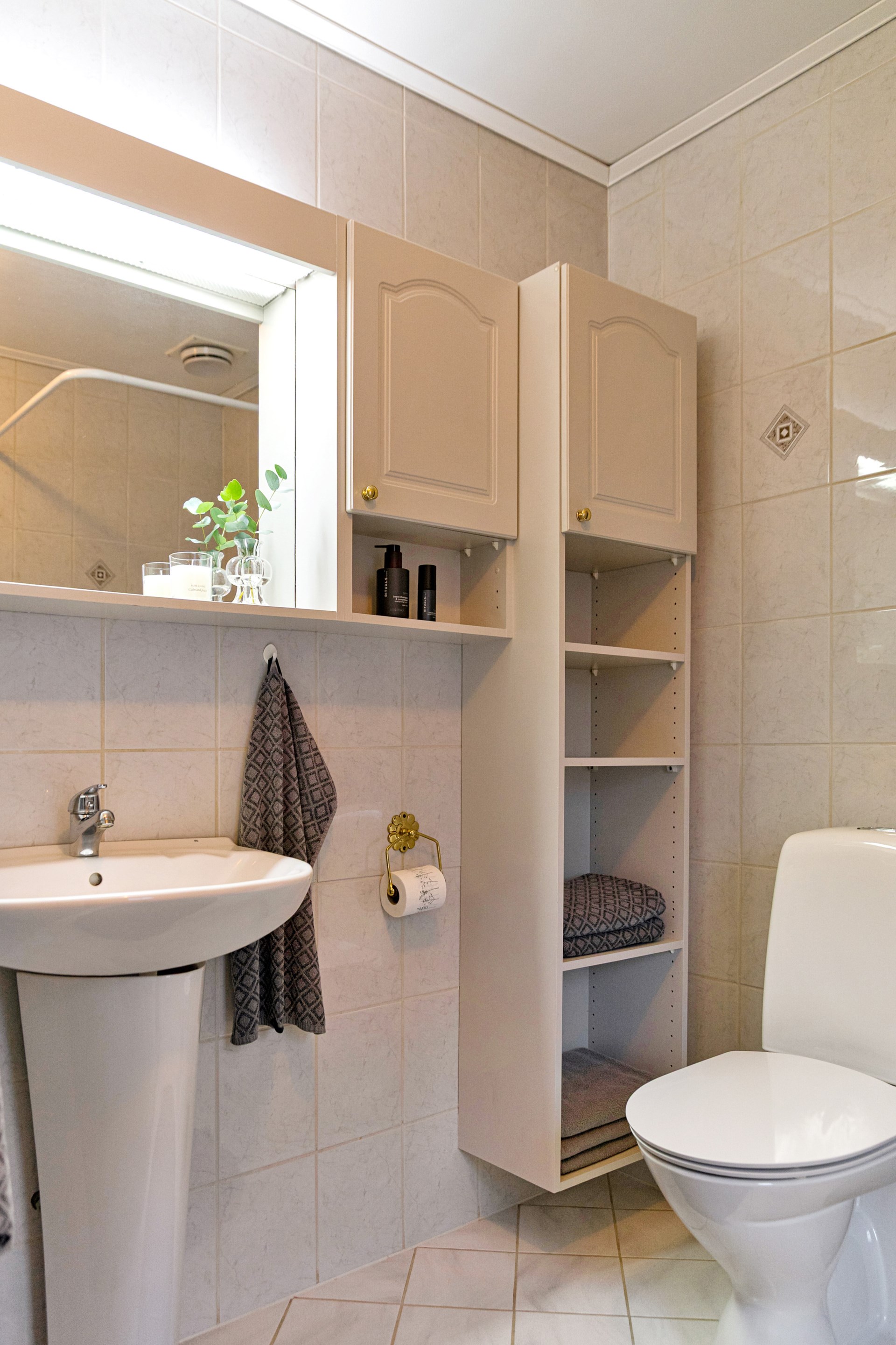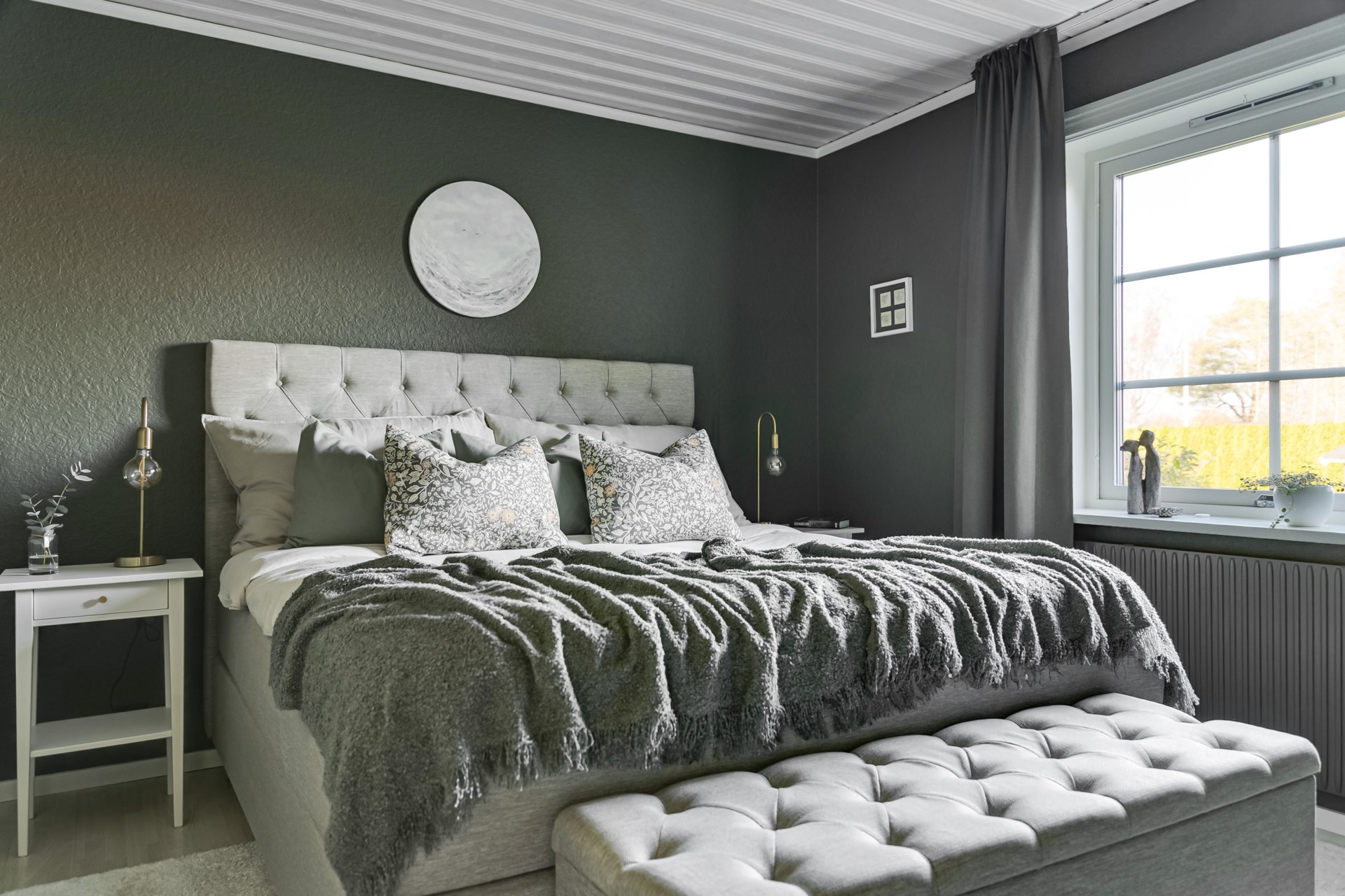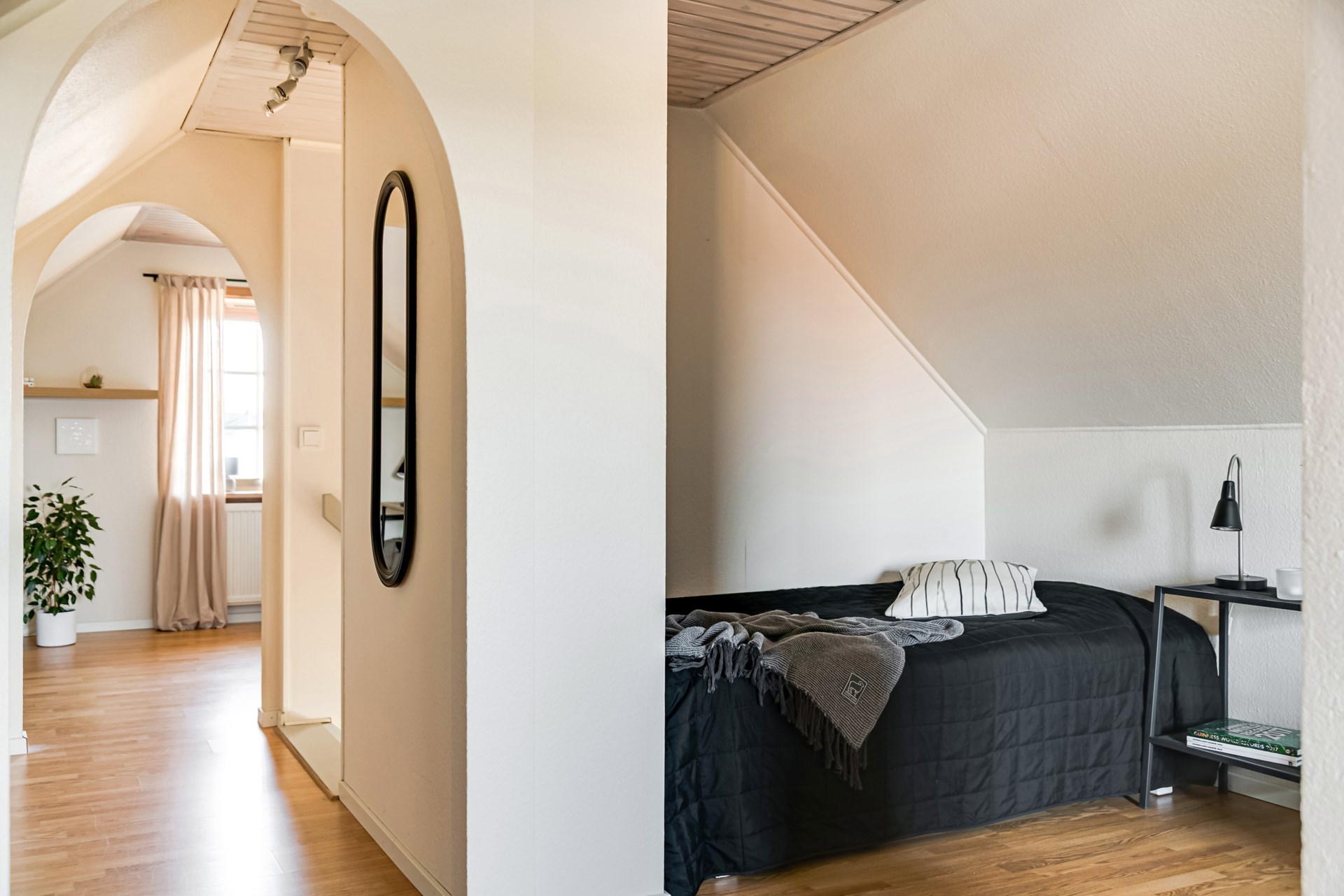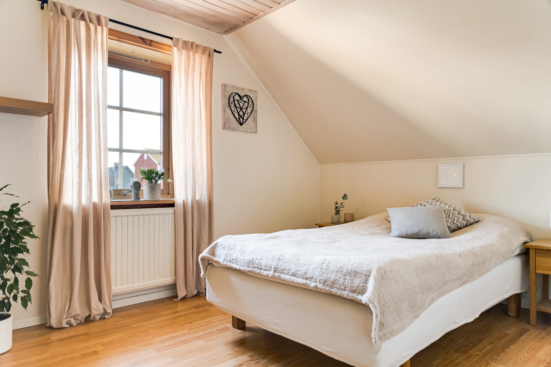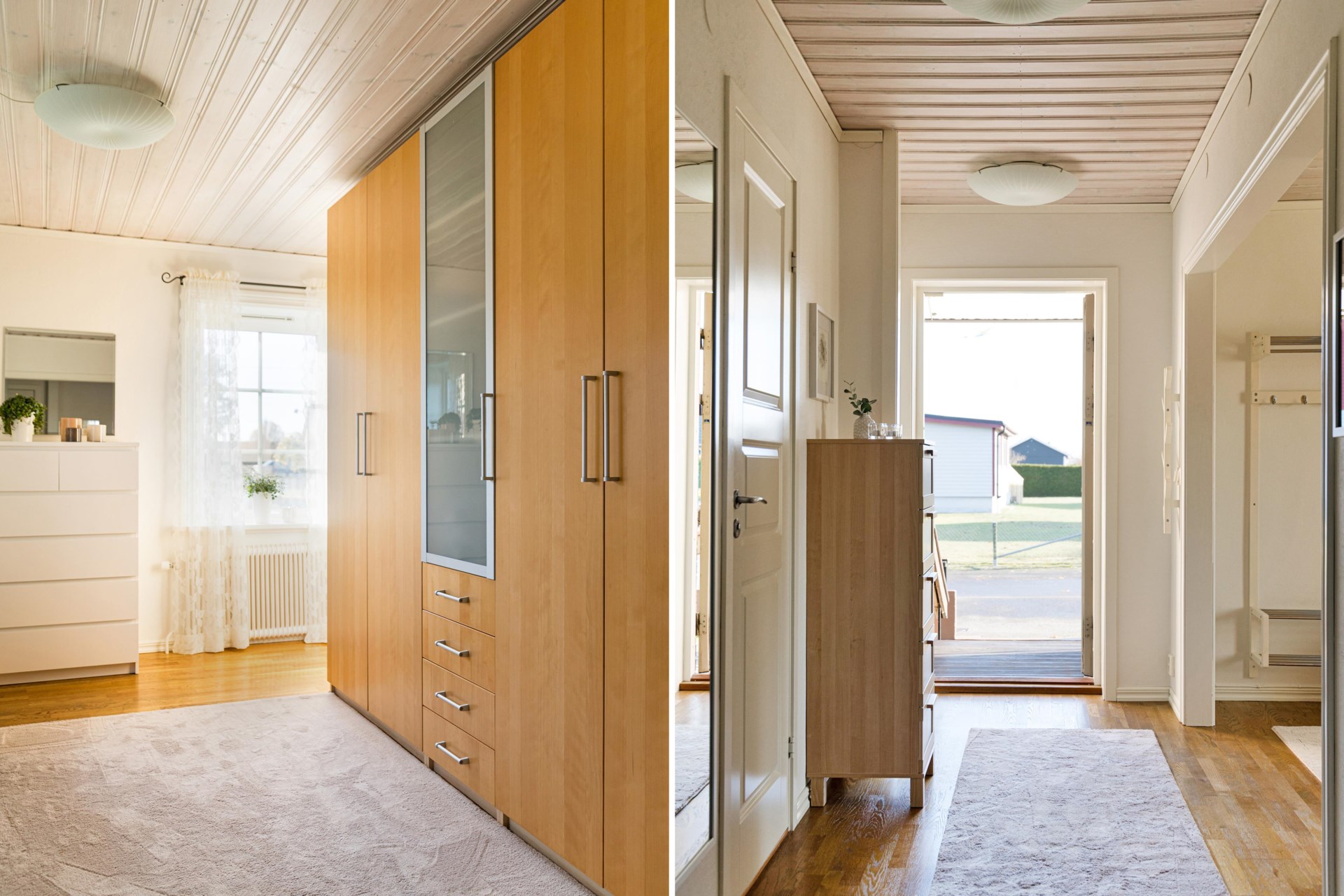 På entréplan finns Master bedroom med garderober och ett angränsande badrum utrustat med dusch. På övre plan finner du ytterligare två sovrum, varav det ena är större och rymmer både säng och soffhörna. Den rymliga hallen erbjuder idag ett stort klädrum med garderober, men kan med fördel återställas till sovrum för den som önskar.Från hallen når du även husets andra badrum med både badkar/dusch, wc och kommod.