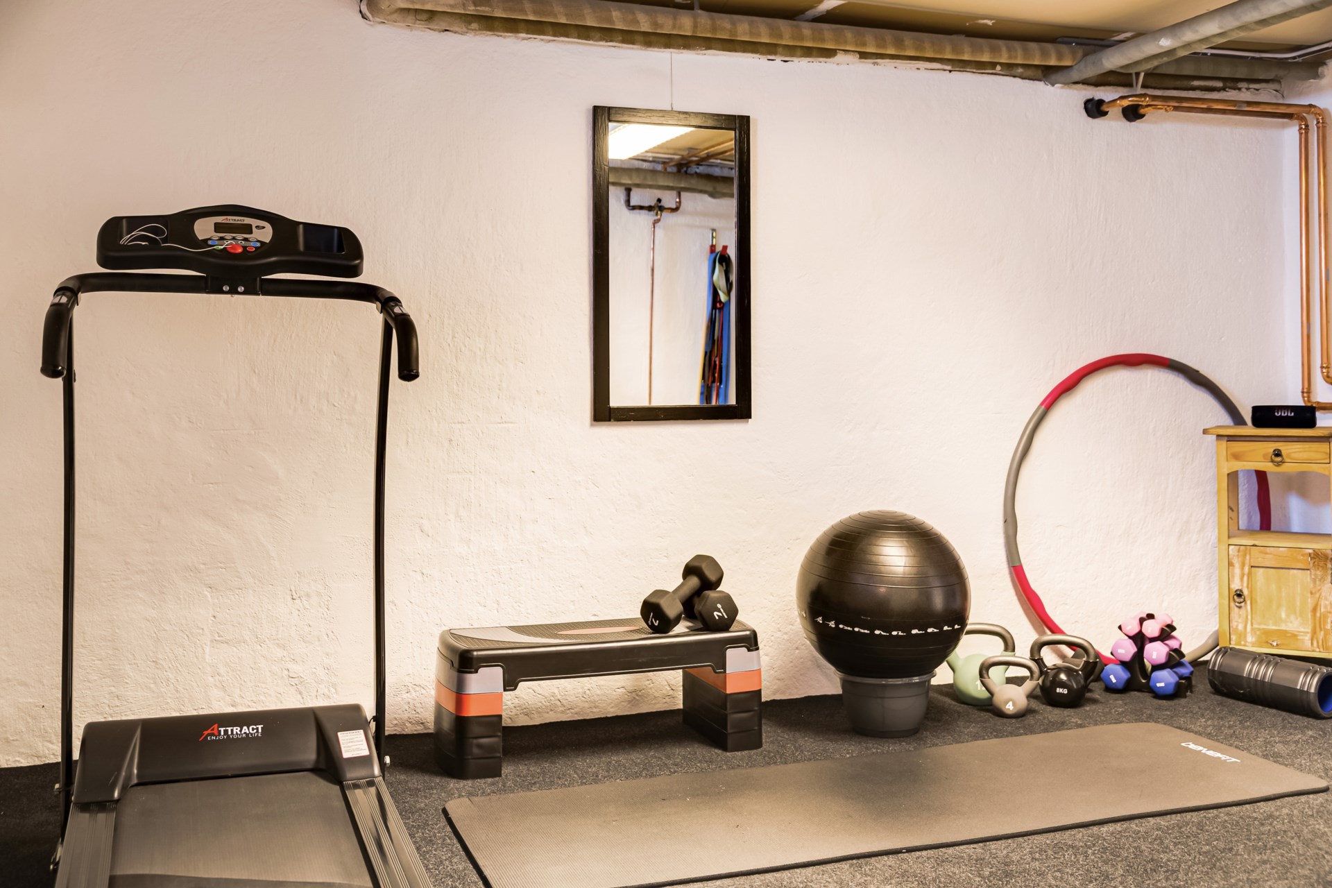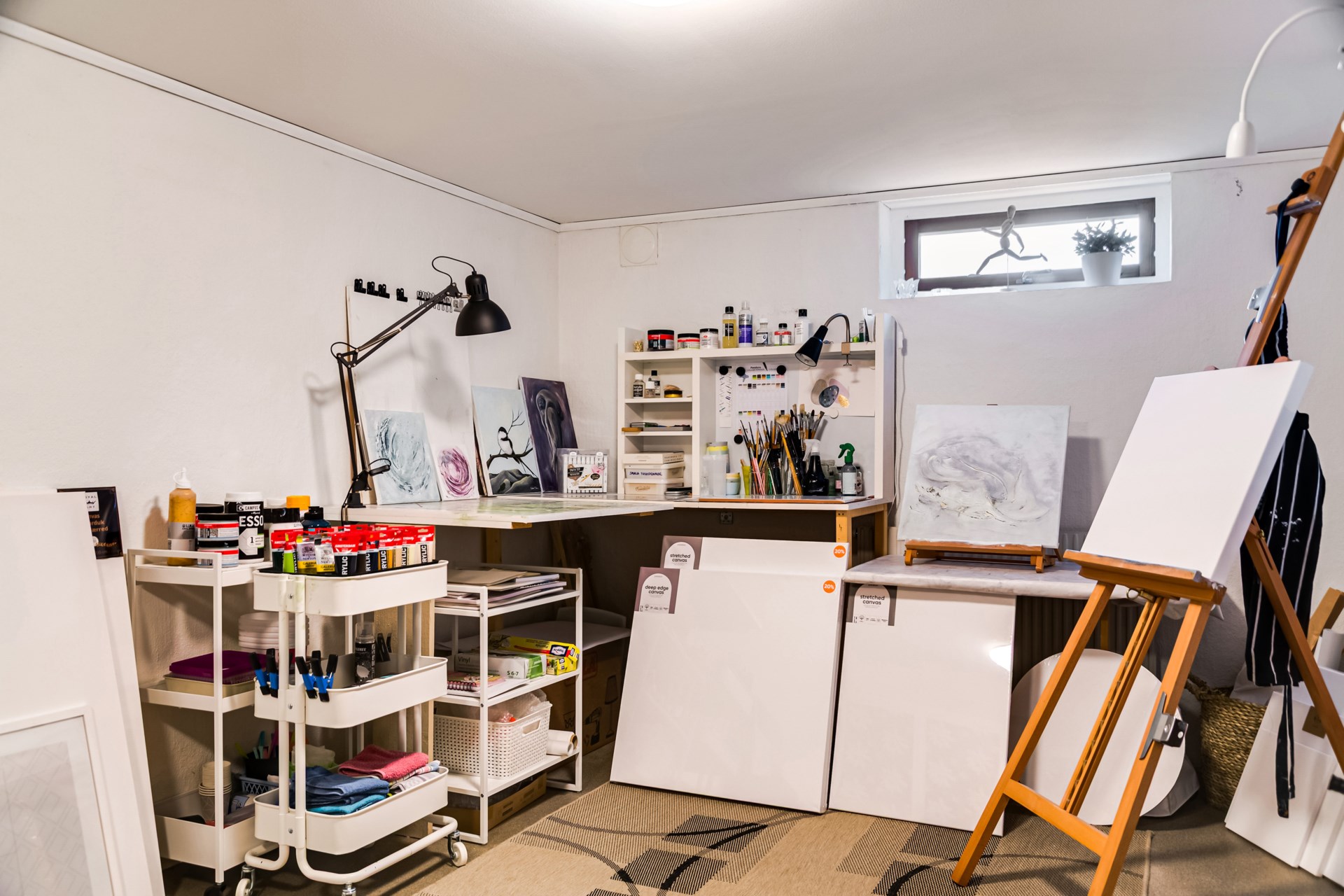 Källaren erbjuder goda ytor för både hobby och förvaring – här finns tvättstuga, ateljé samt ett teknikrum som idag används som hemmagym.
