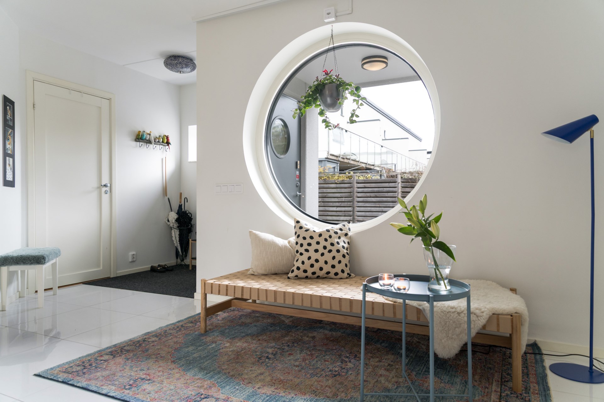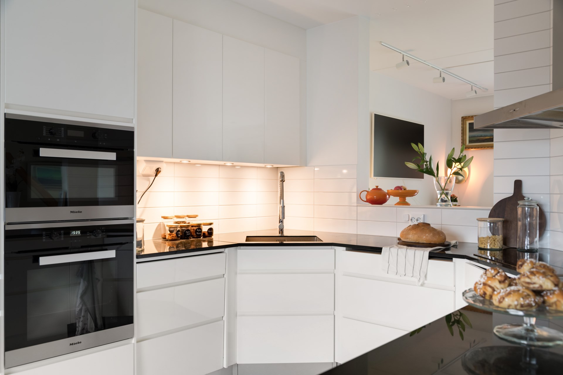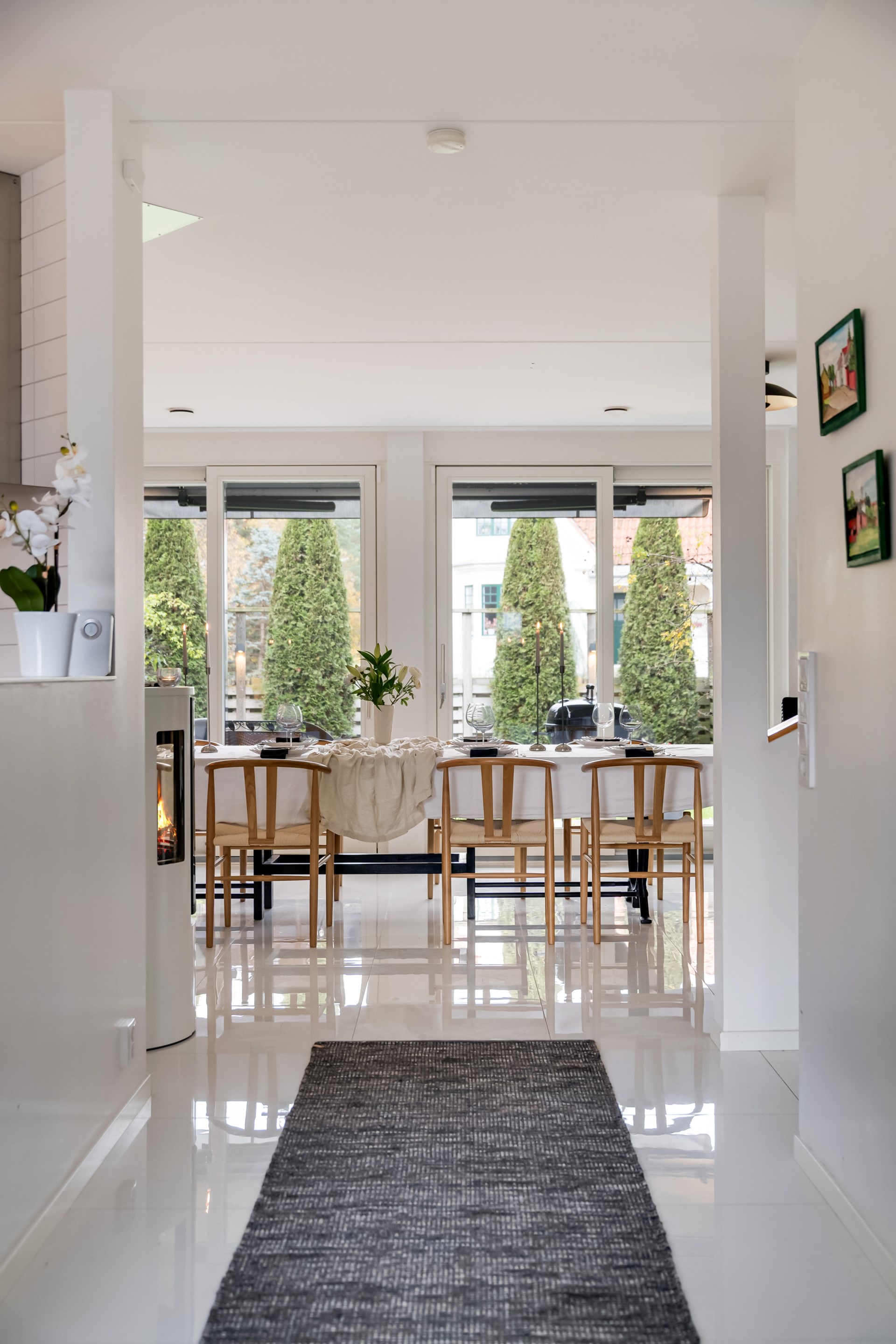 Redan vid entrén välkomnas du av det vackra runda fönstret – ett smycke som sätter tonen för resten av huset. Innanför dörren öppnar sig ett rymligt kök med bänkskivor i svart granit och noga utvalda, integrerade vitvaror som gör vardagen både enkel och elegant. Här finns plats för långa frukostar och middagar med vänner medan ljuset flödar in.