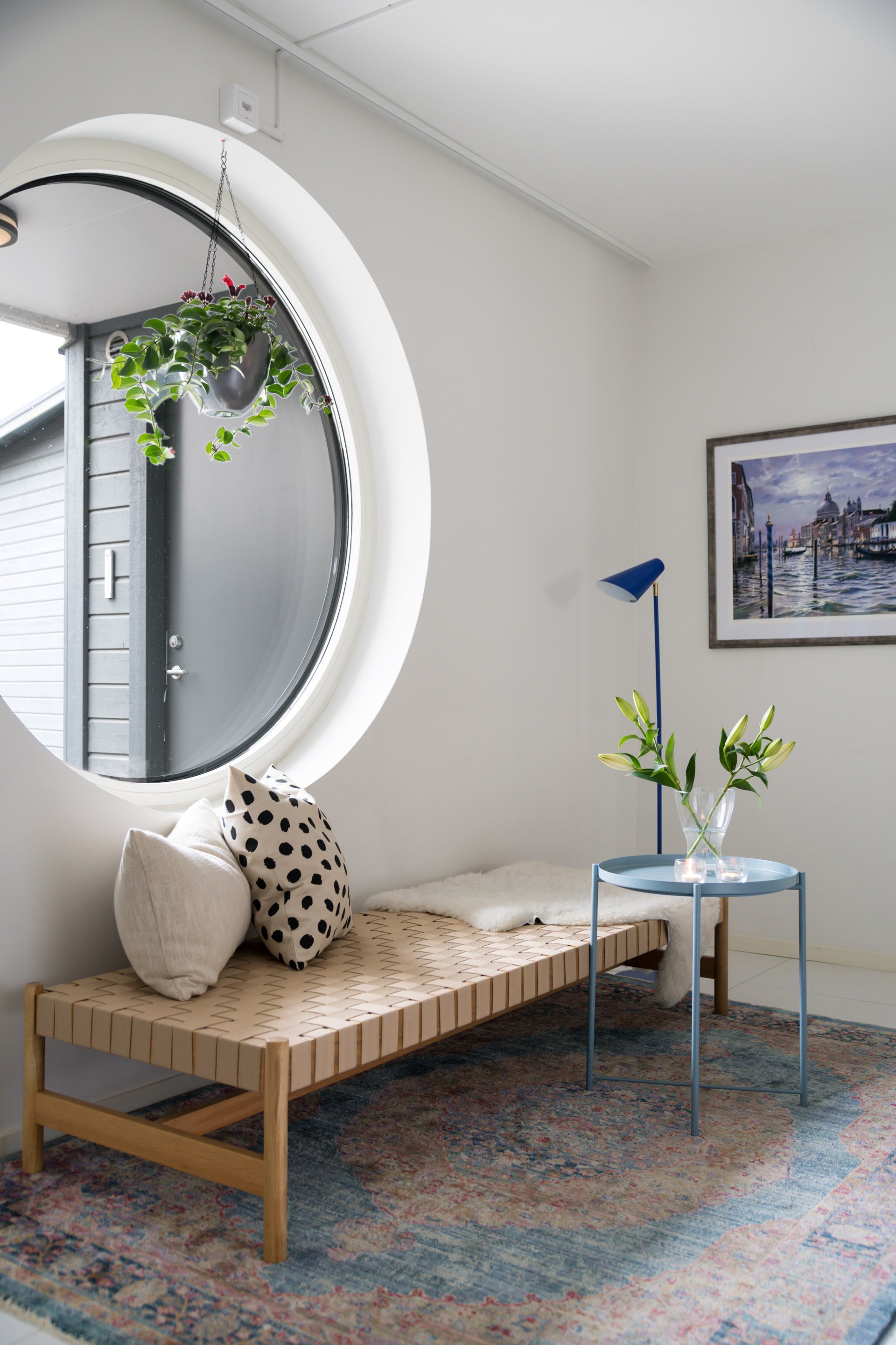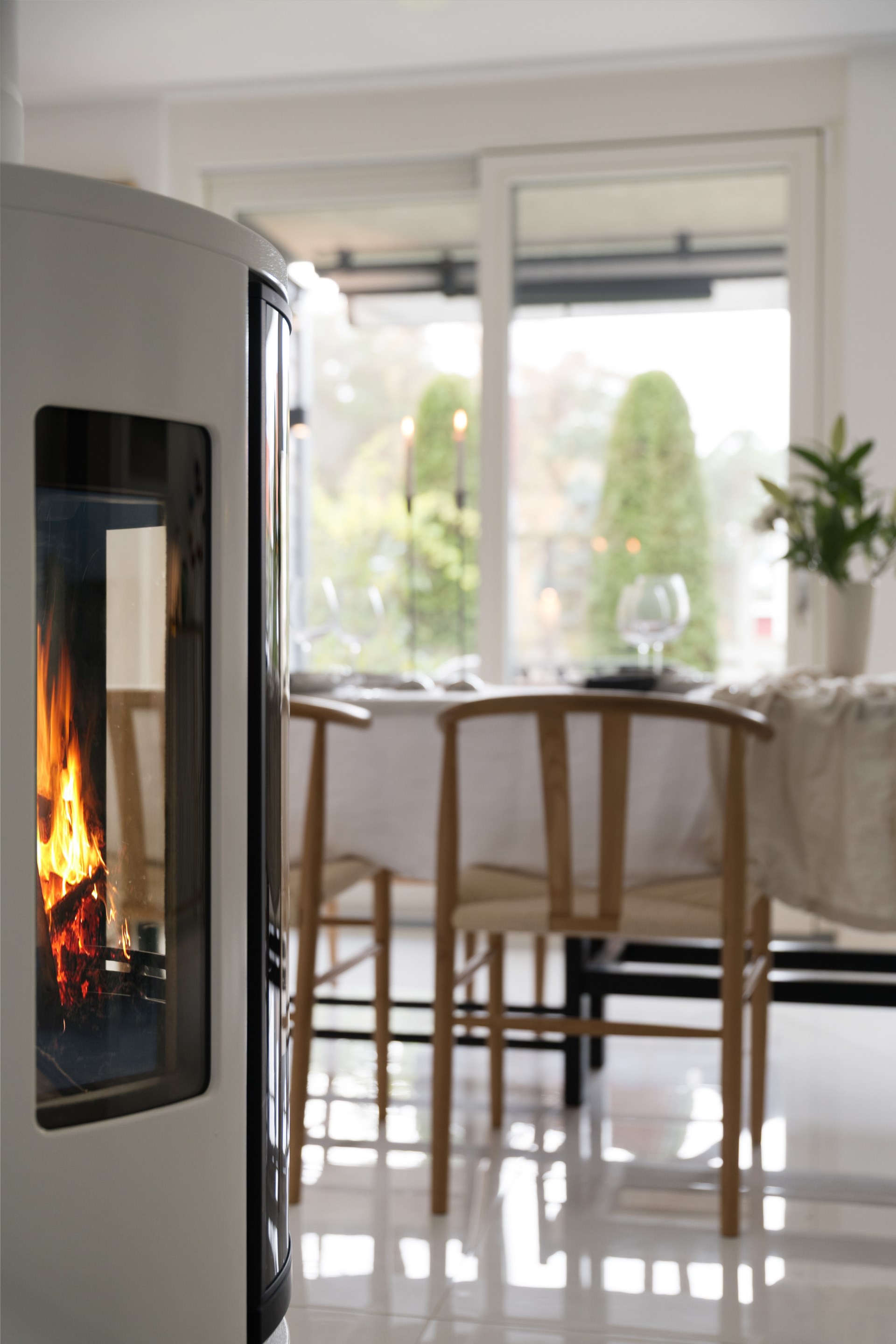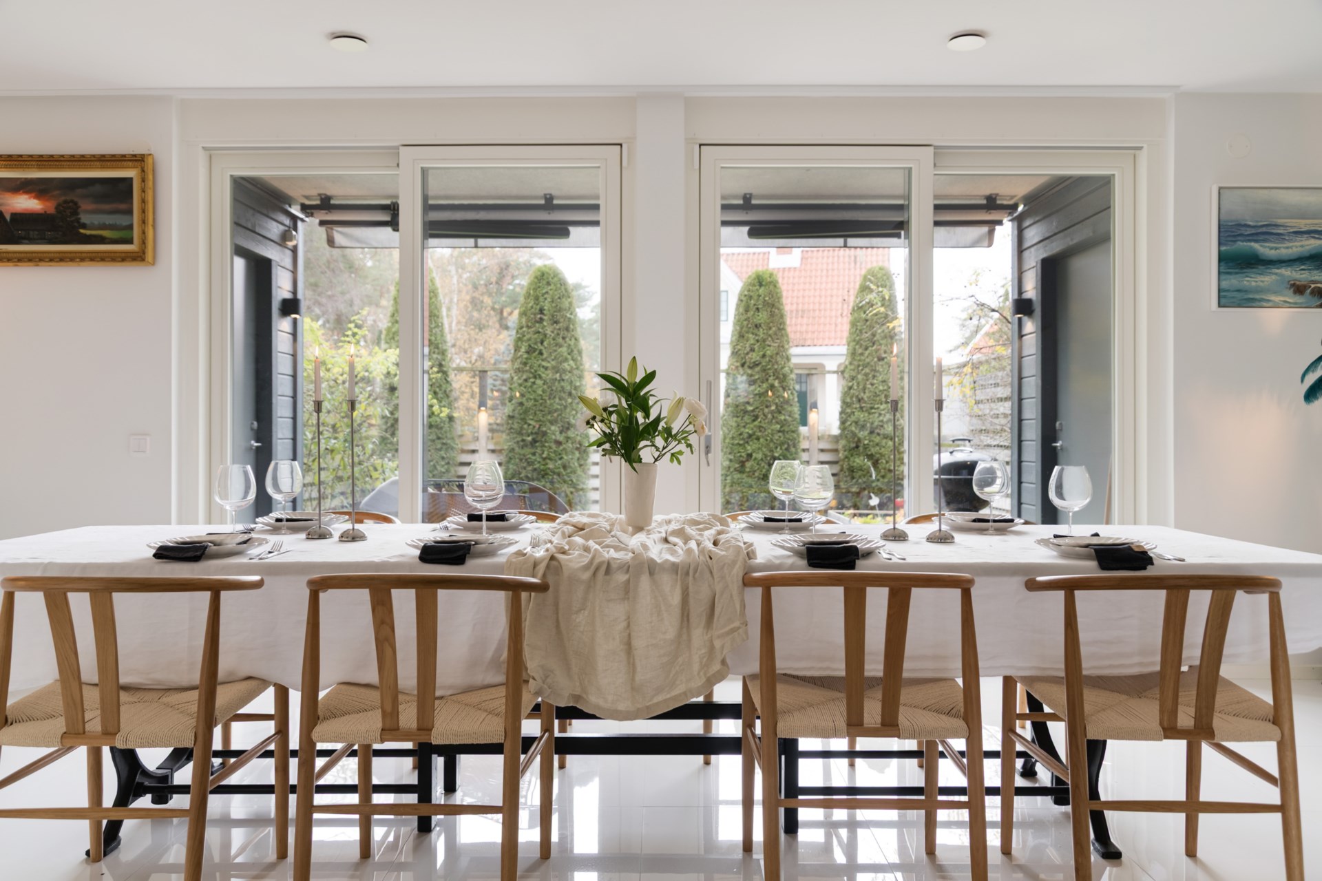 Redan vid entrén välkomnas du av det vackra runda fönstret – ett smycke som sätter tonen för resten av huset. Innanför dörren öppnar sig ett rymligt kök med bänkskivor i svart granit och noga utvalda, integrerade vitvaror som gör vardagen både enkel och elegant. Här finns plats för långa frukostar och middagar med vänner medan ljuset flödar in.