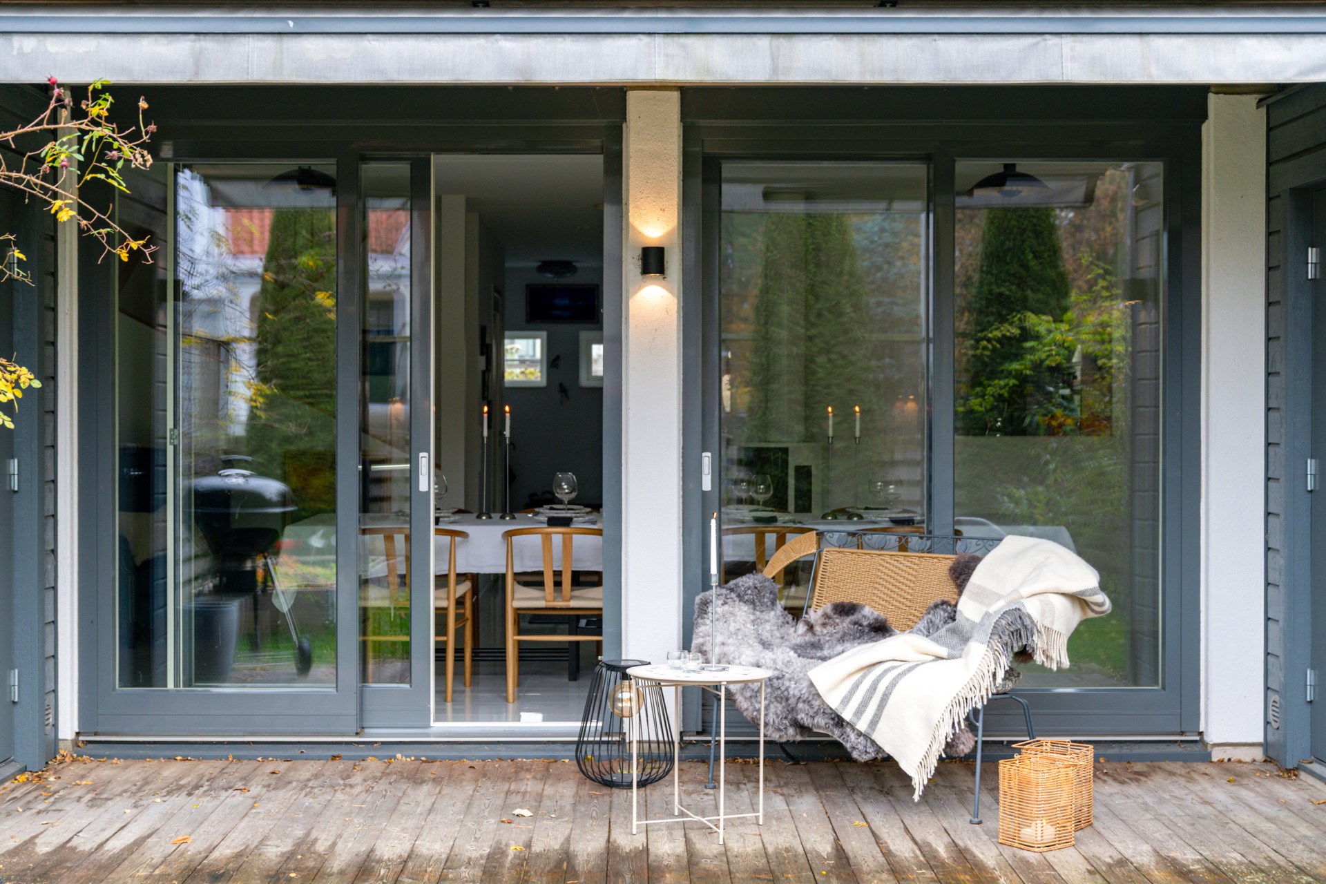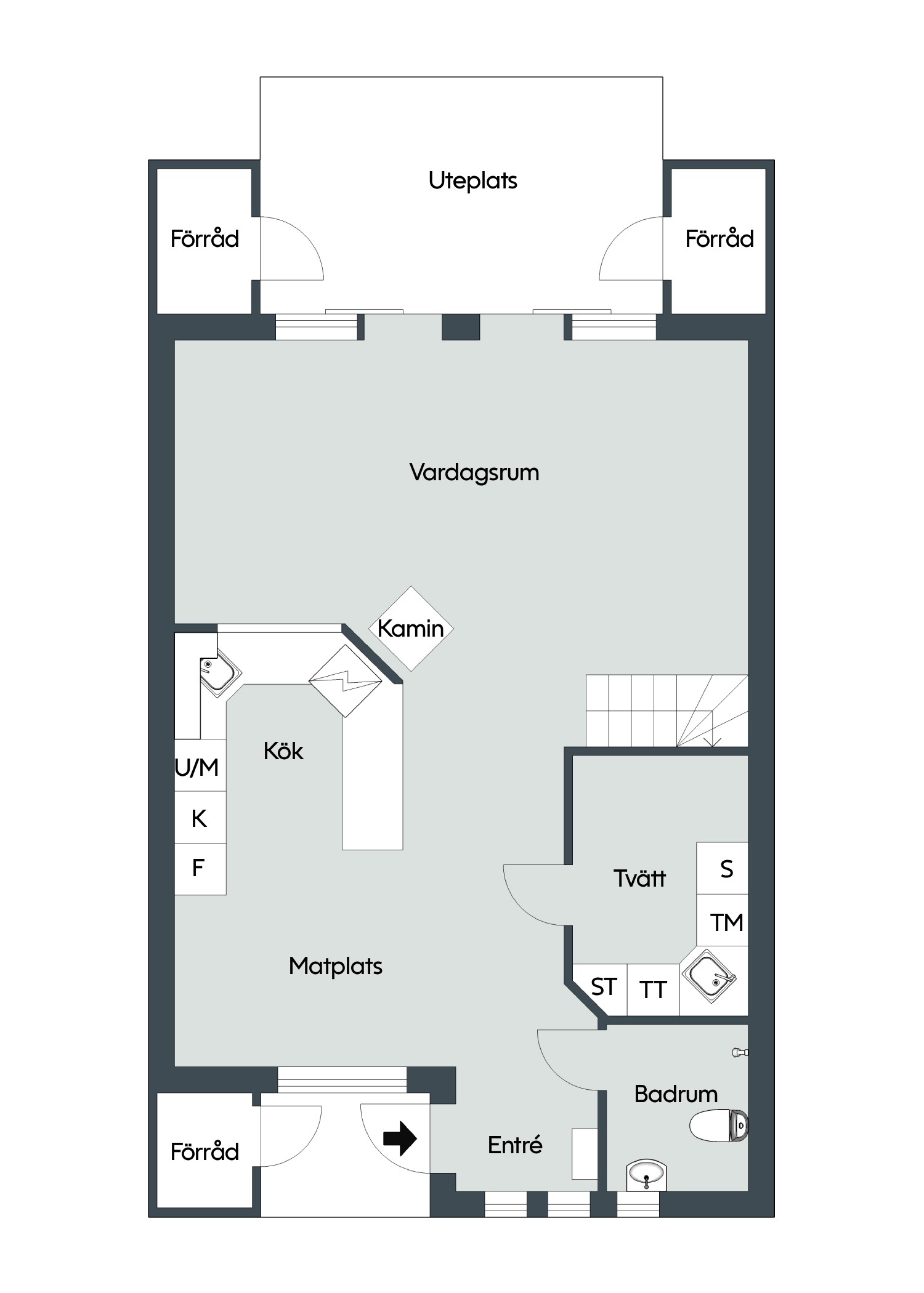 Vidare in i hemmet väntar det stora allrummet där kaminen sprider värme och trivsel under årets kalla månader. De stora skjutdörrarna leder ut till en privat oas – en uteplats med trädäck och grönska, perfekt för både avkoppling och gemenskap. Den elstyrda markisen över uteplatsen känner av både väder och vind. Här finns plats att odla, njuta och leva.