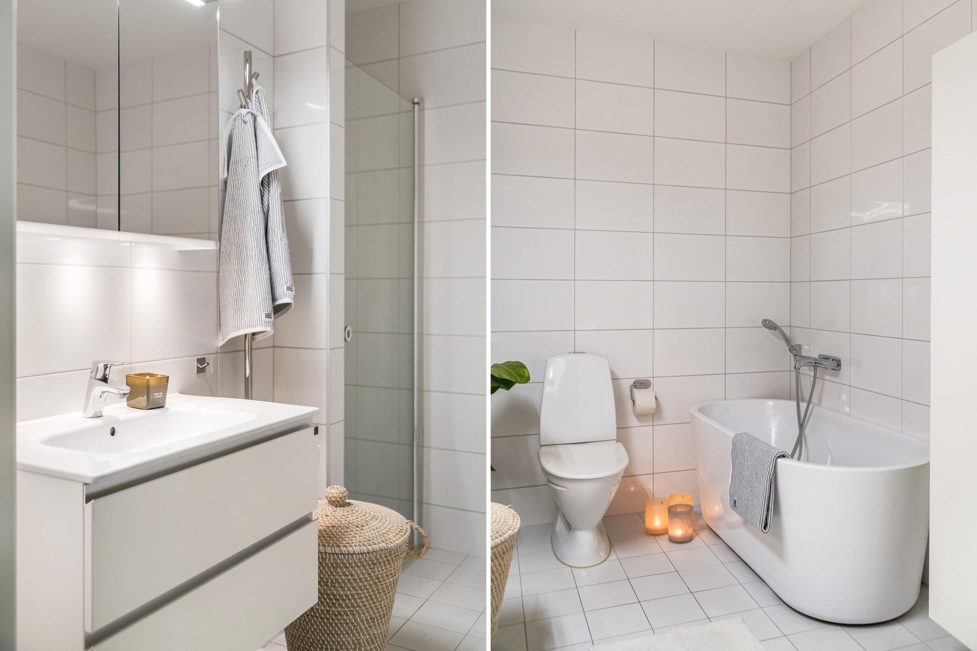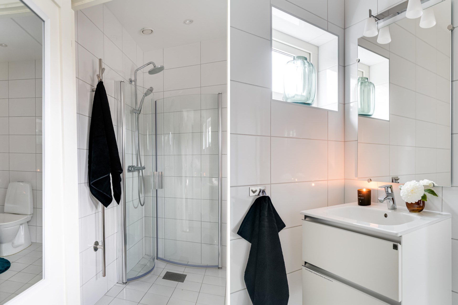 På nedre plan finns även ett fräscht badrum med dusch samt en egen tvättstuga med både tvättmaskin och torktumlare – praktiskt och stilrent.