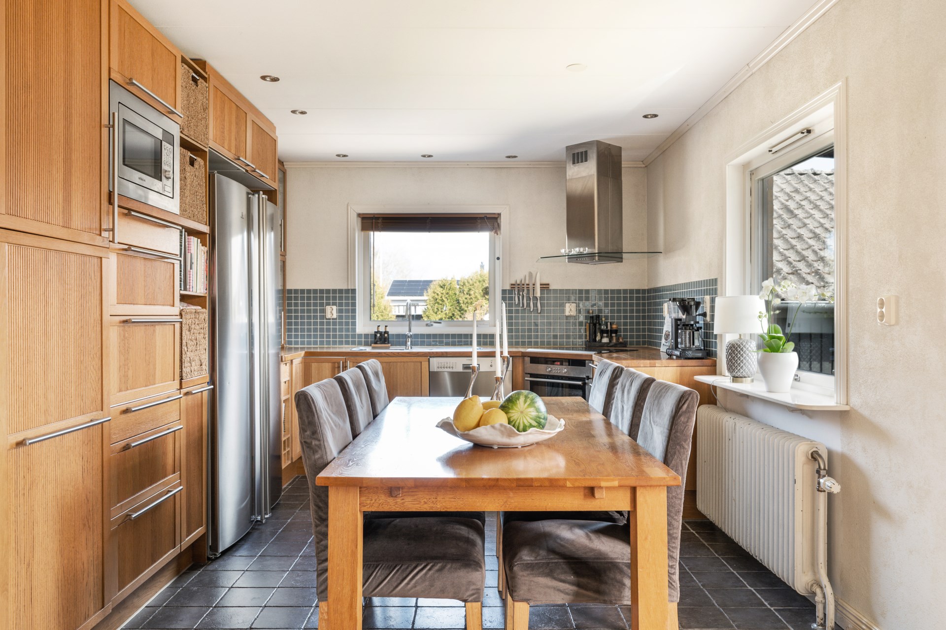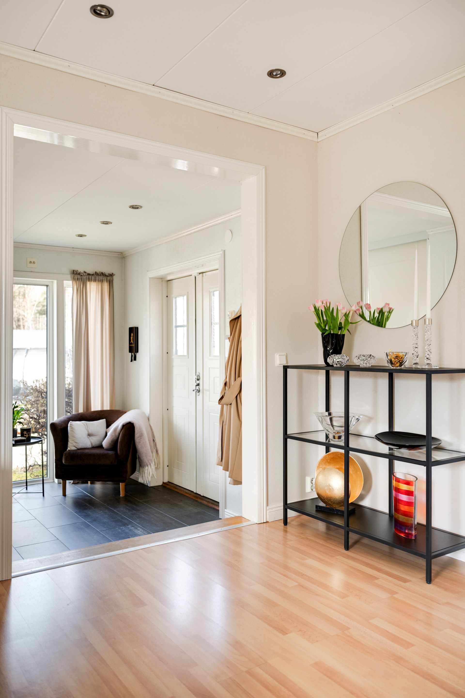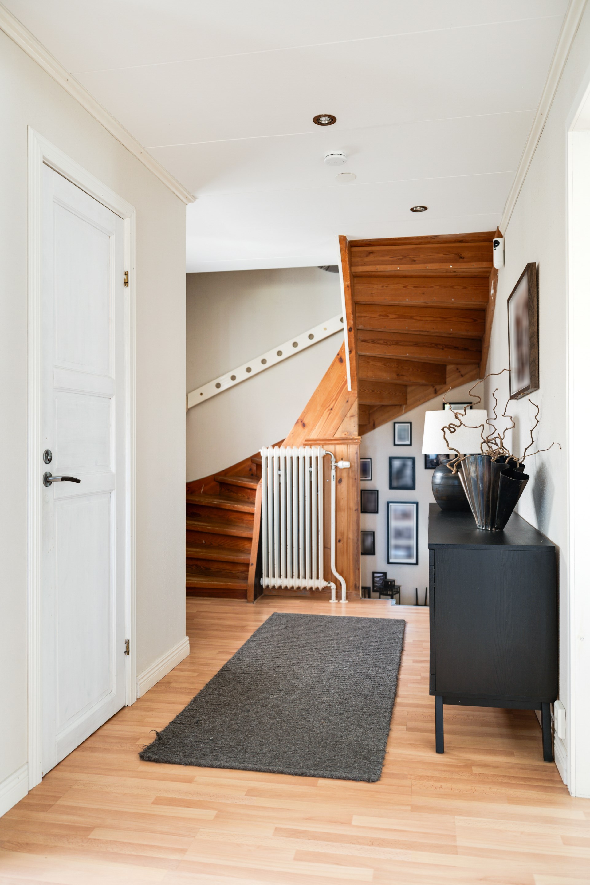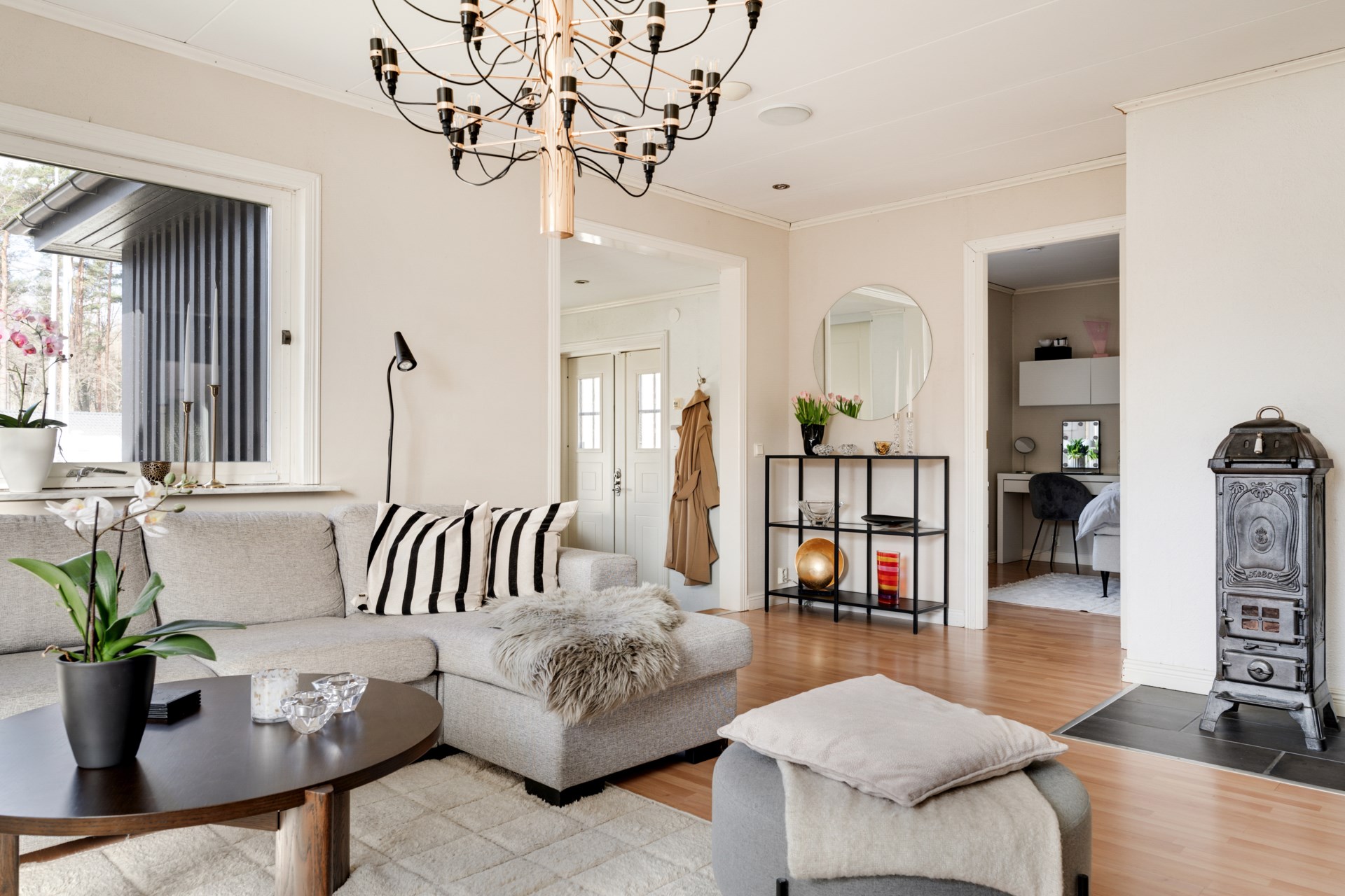 Redan vid entrén möts du av en rymlig och inbjudande hall med gott om plats för både avhängning och förvaring.. Vidare in finner du ett stort och luftigt vardagsrum där en vacker gjutjärnskamin står som rummets hjärta och bidrar med både värme och en hög mysfaktor.