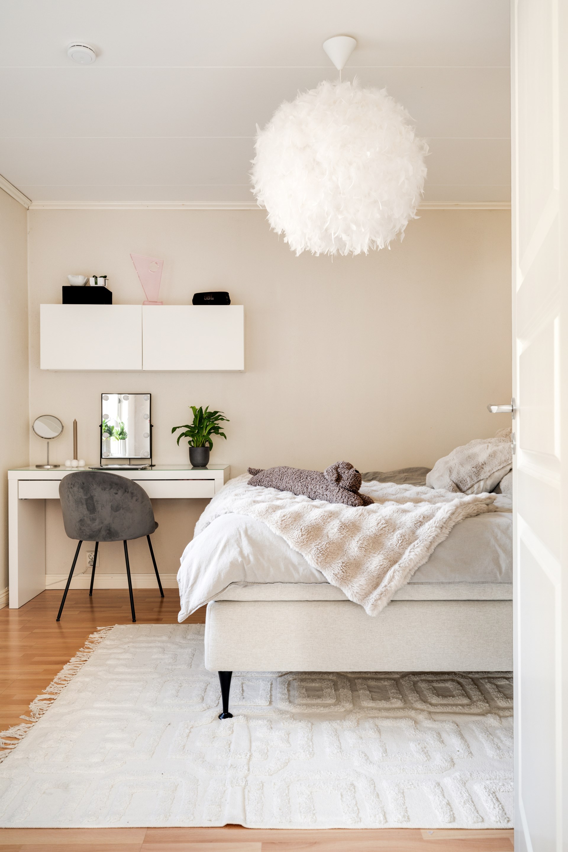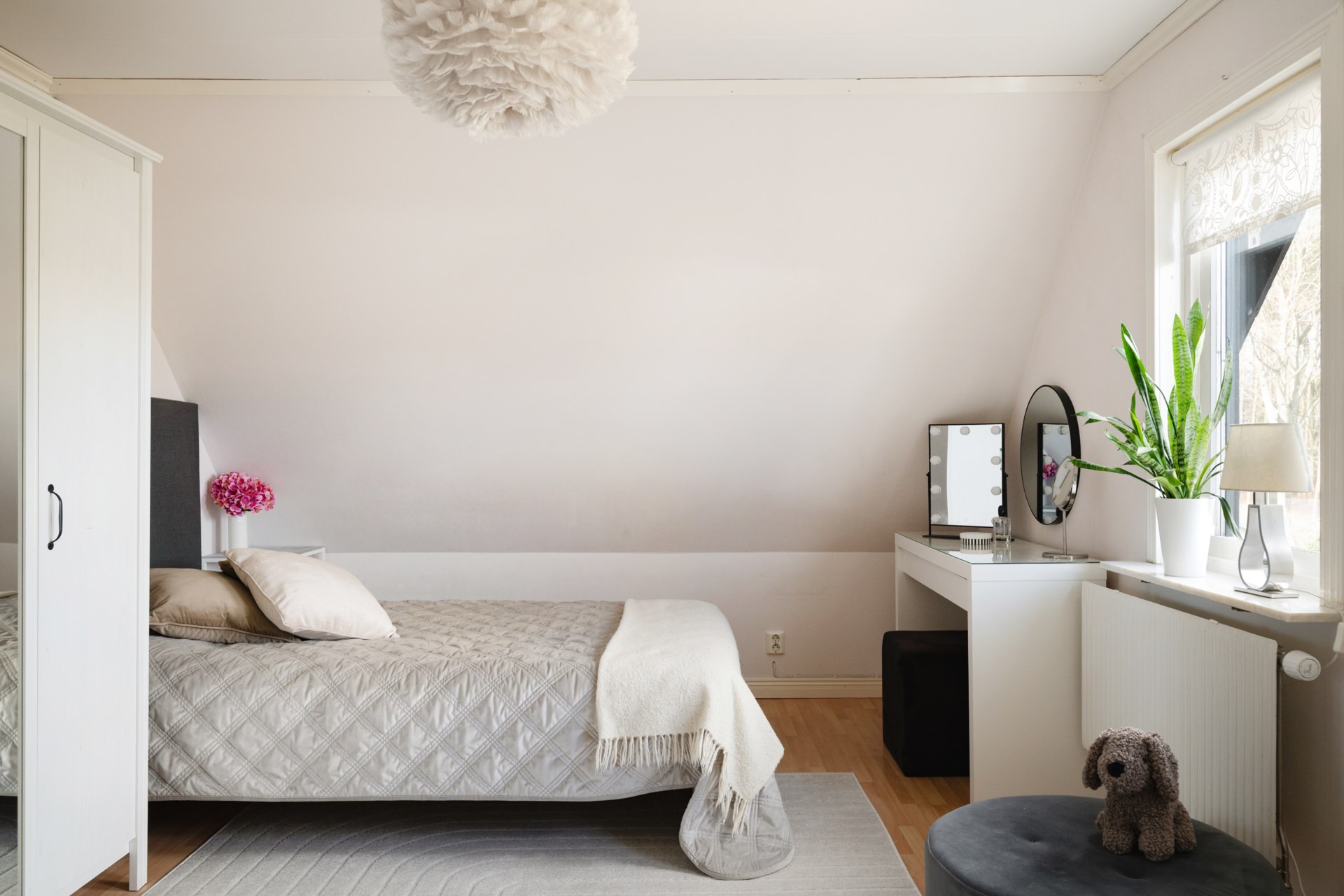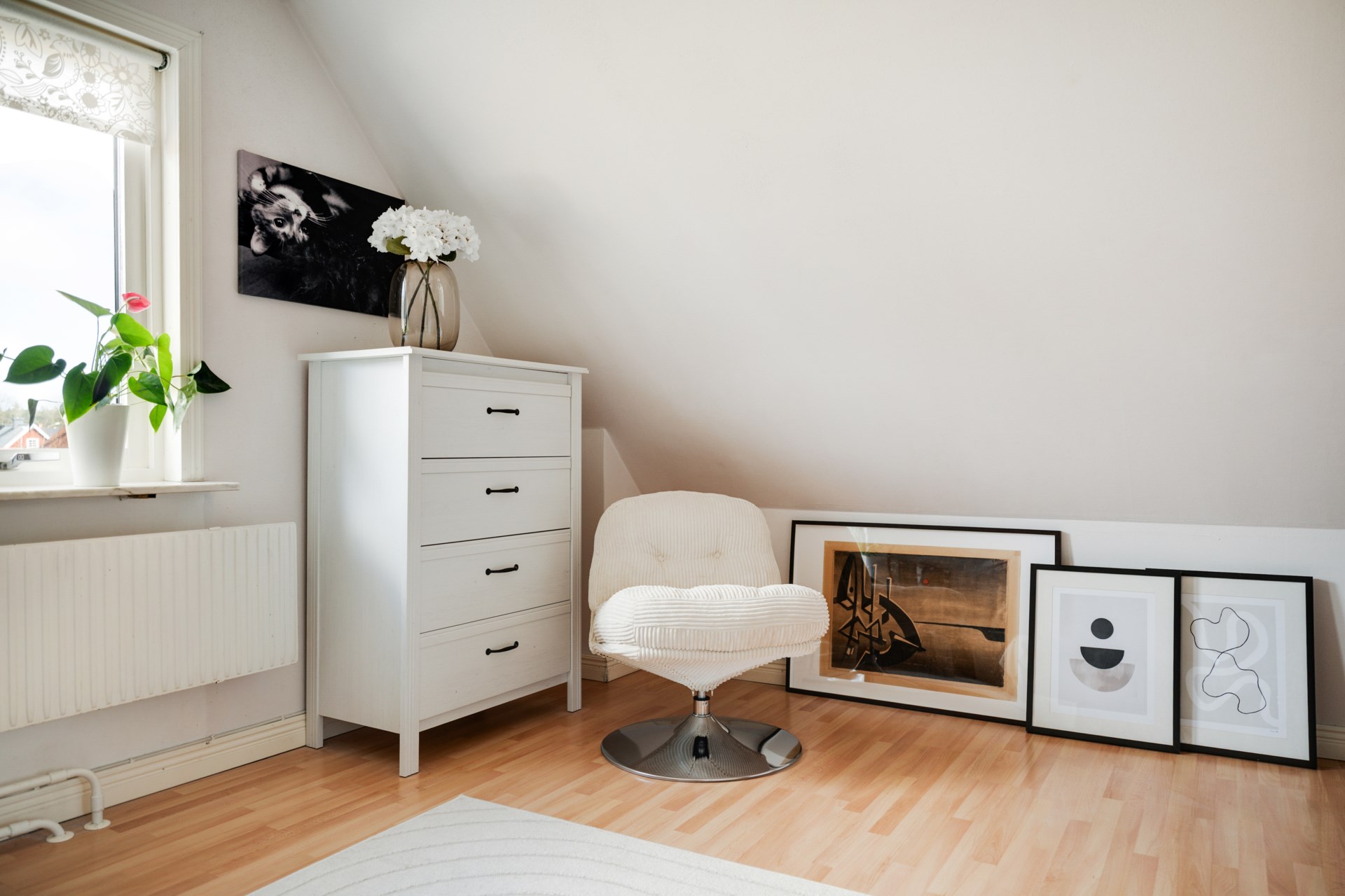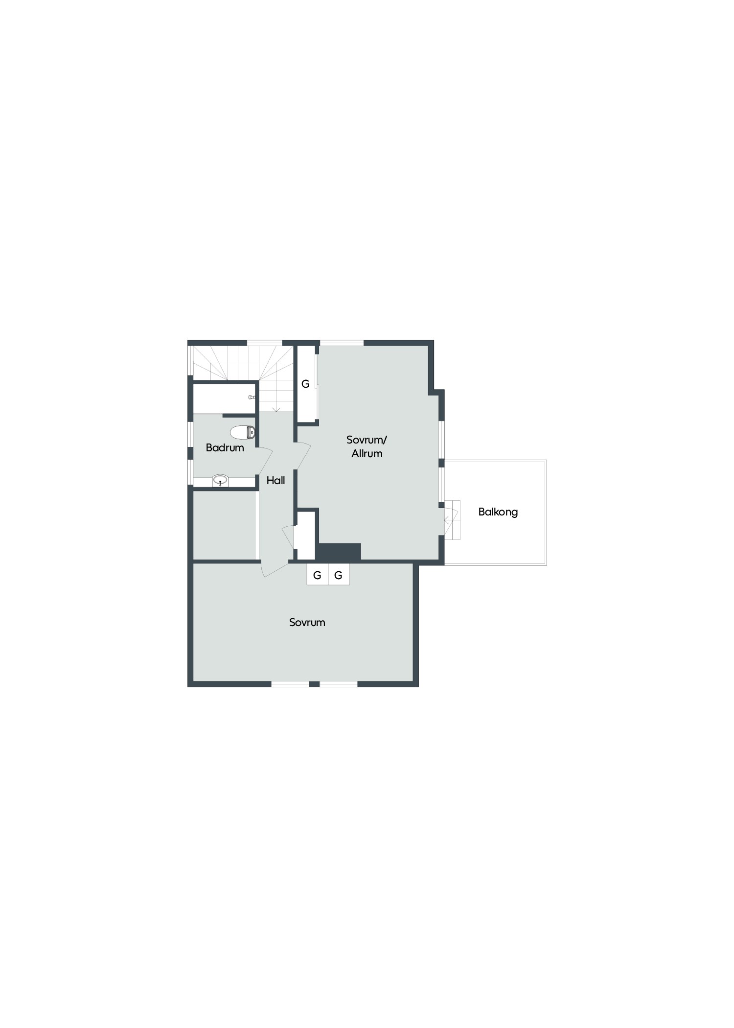 En trappa upp väntar ett generöst allrum som med enkelhet kan anpassas efter behov – exempelvis som TV-rum, lekyta eller ytterligare sovrum. Härifrån nås även husets balkong. På detta plan finns dessutom ett större sovrum samt ett badrum utrustat med dusch.