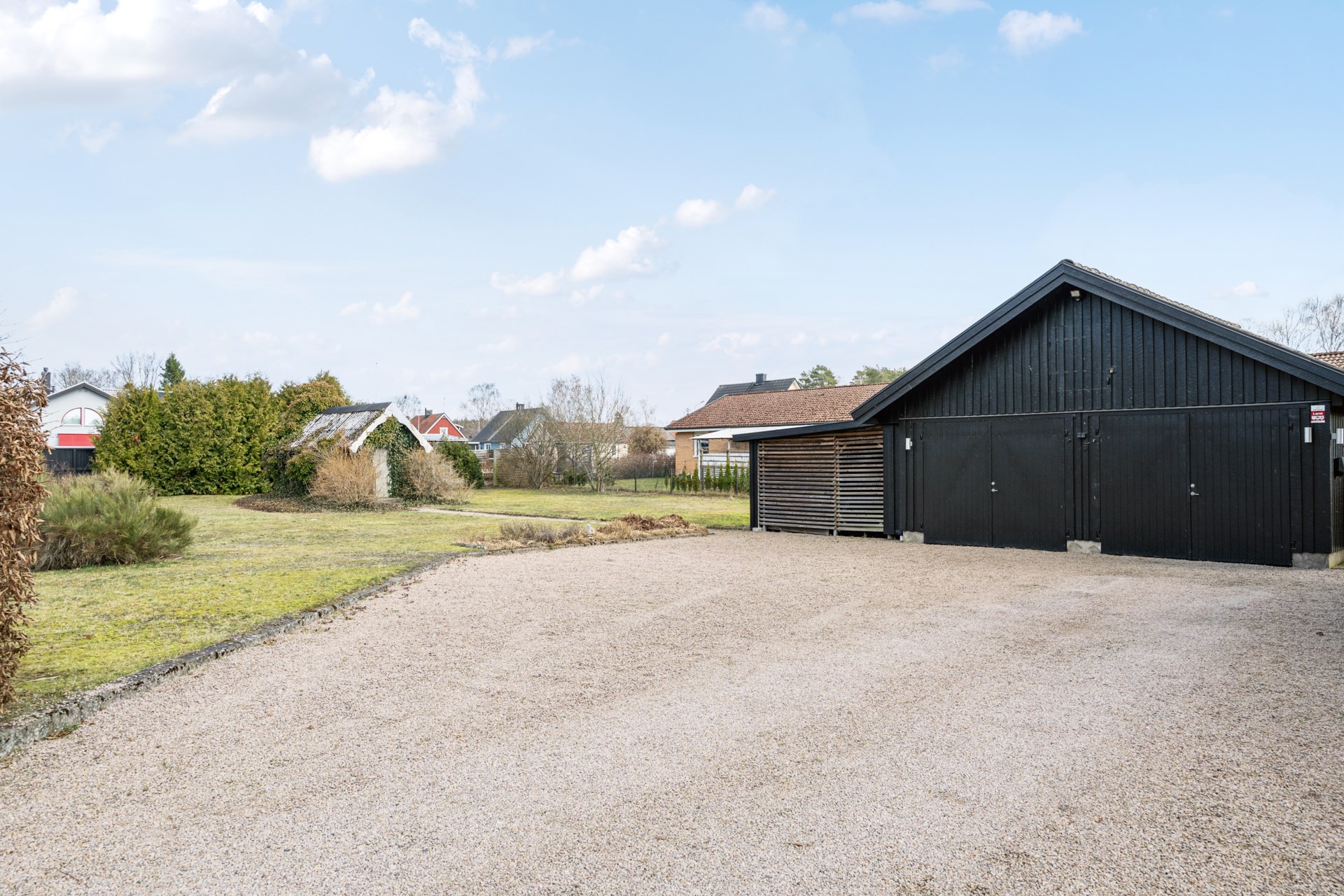 Den stora och lättskötta trädgården bjuder in till både lek och umgänge. På tomten finns ett rejält dubbelgarage med mycket goda förvaringsmöjligheter eller plats för hobbyverksamhet. Uppfarten rymmer flera bilar och är dessutom utrustad med elbilsladdare. Det charmiga lilla gårdshuset har tidigare fungerat som hönshus.