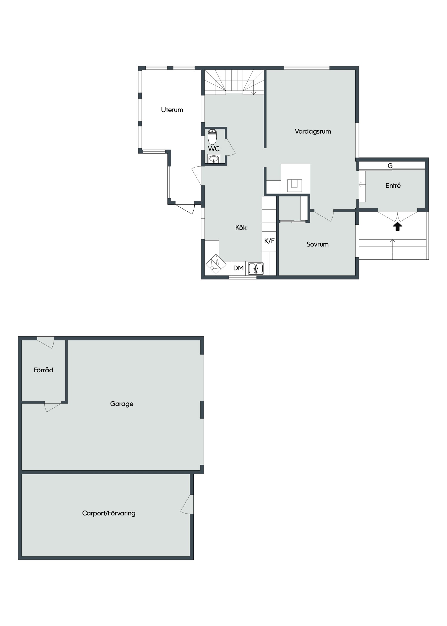 Entréplanet rymmer även ett praktiskt kök med tillhörande matplats, ett rymligt sovrum samt en gäst-WC. Från köket når du även husets uterum.