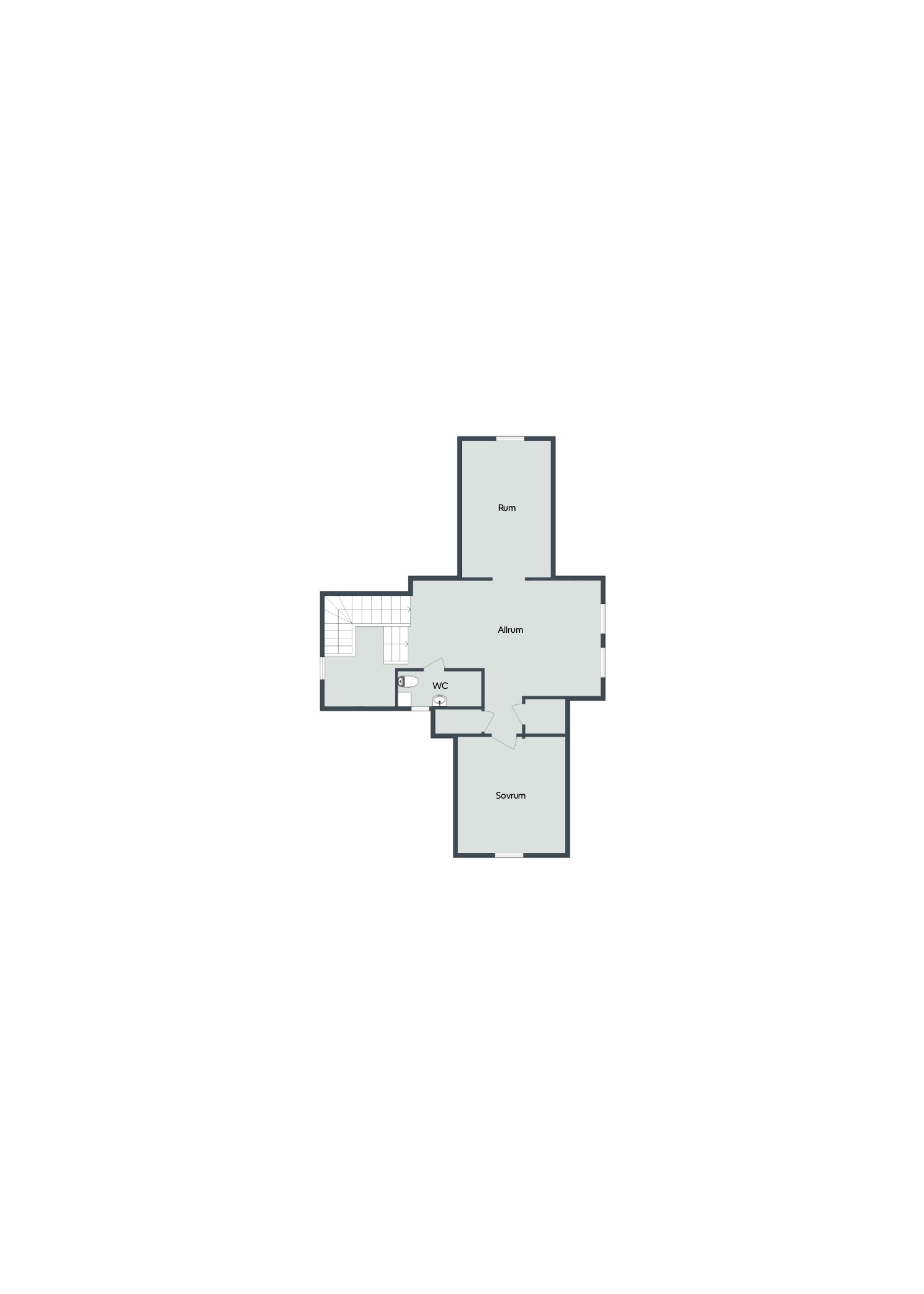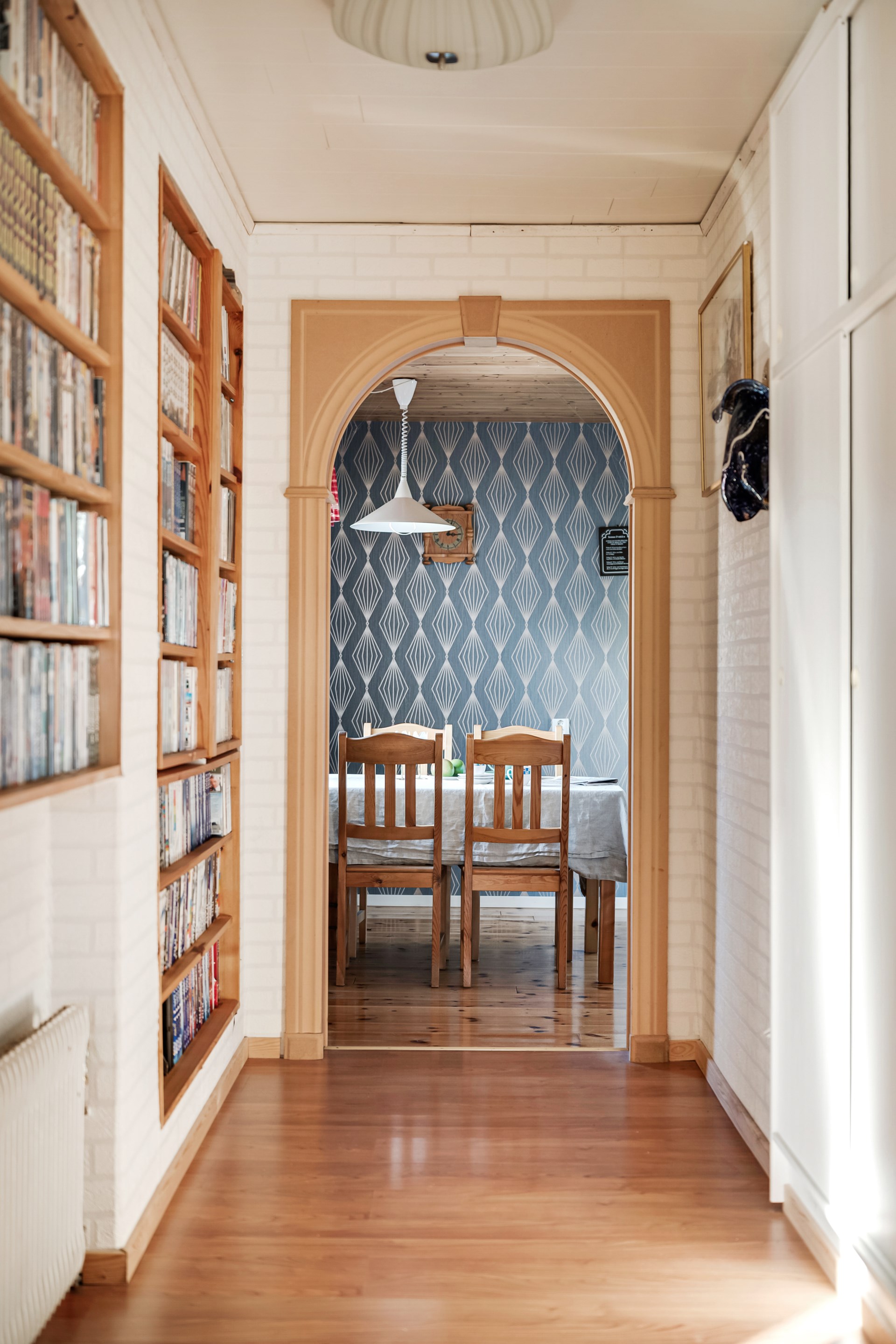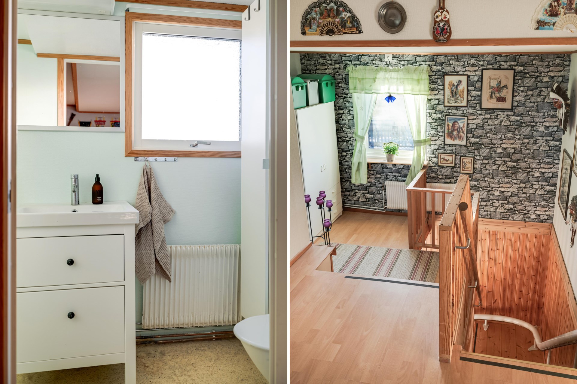 Invändigt finns ett större kök med plats för matbord samt ett vardagsrum med generösa sällskapsytor. Badrummet med dusch renoverades år 2016. På övre plan finns sovrum, allrum samt ett wc.