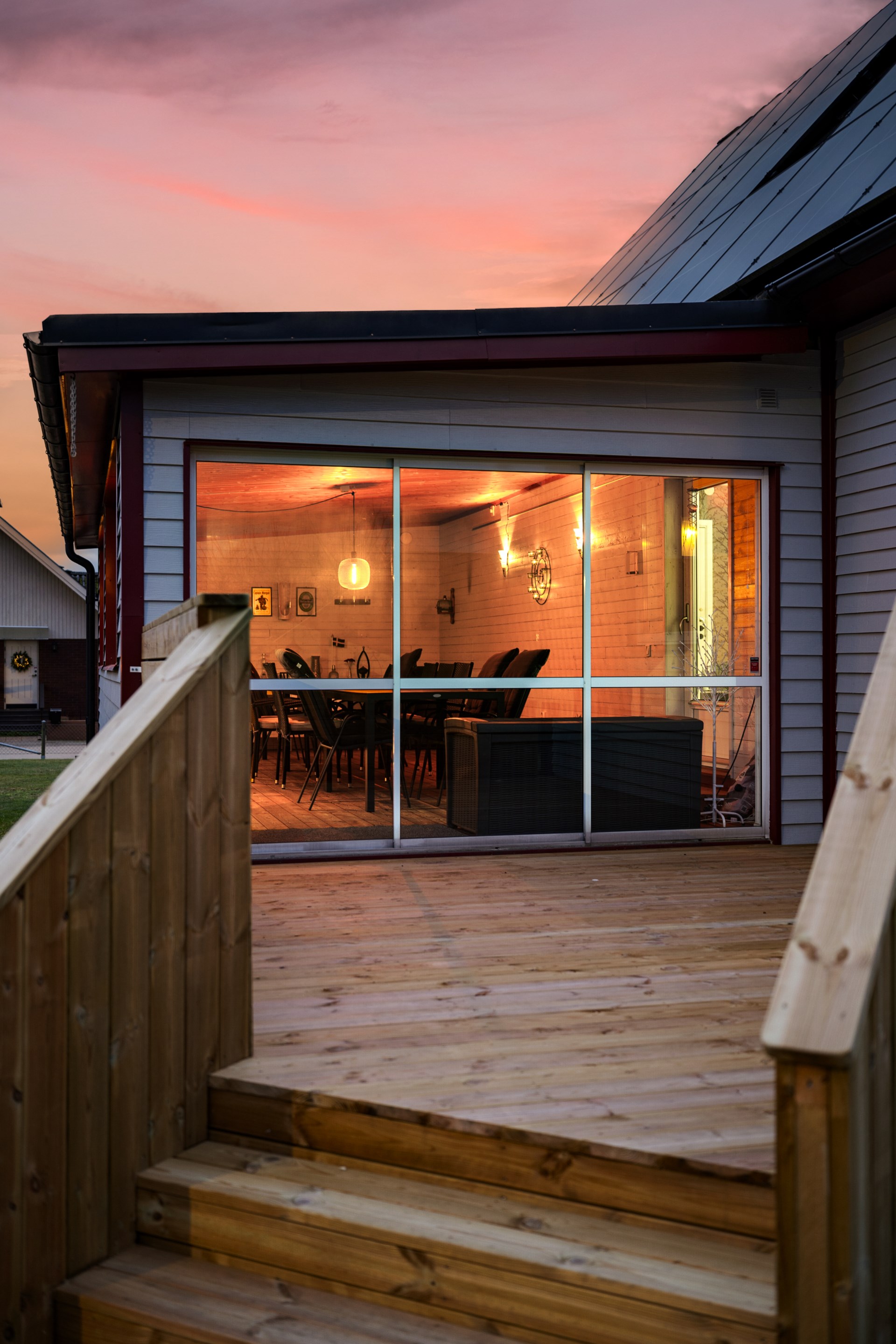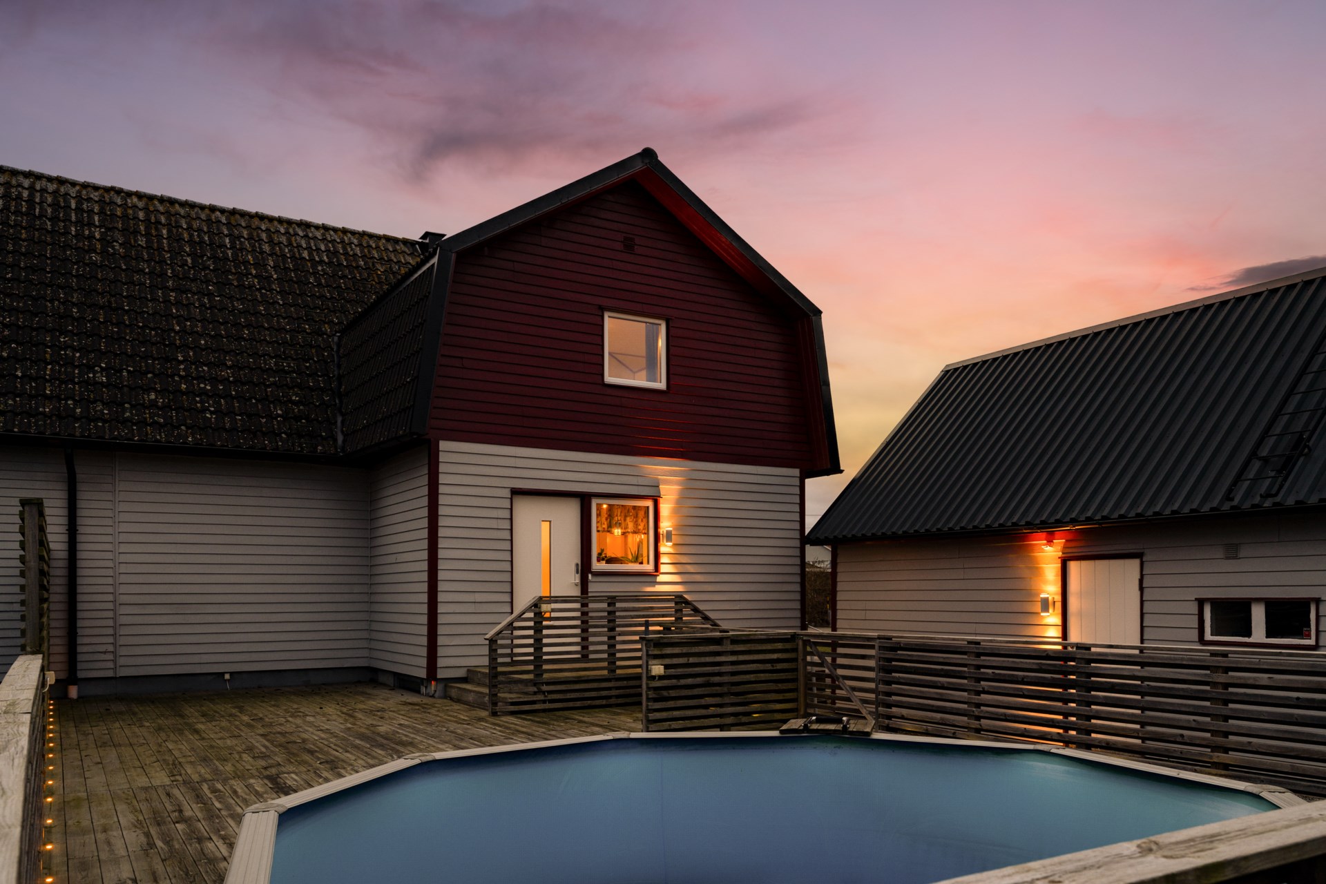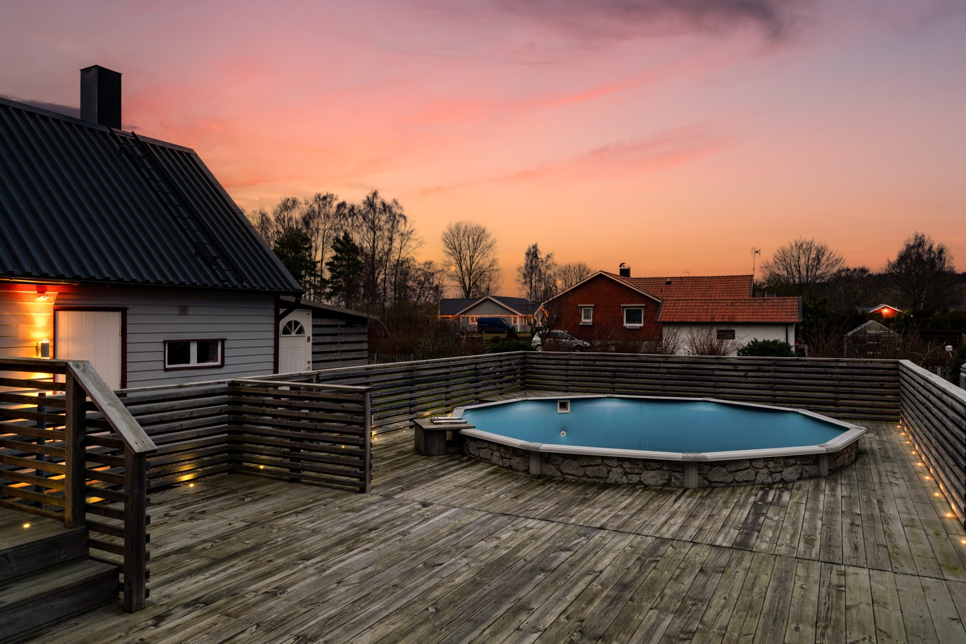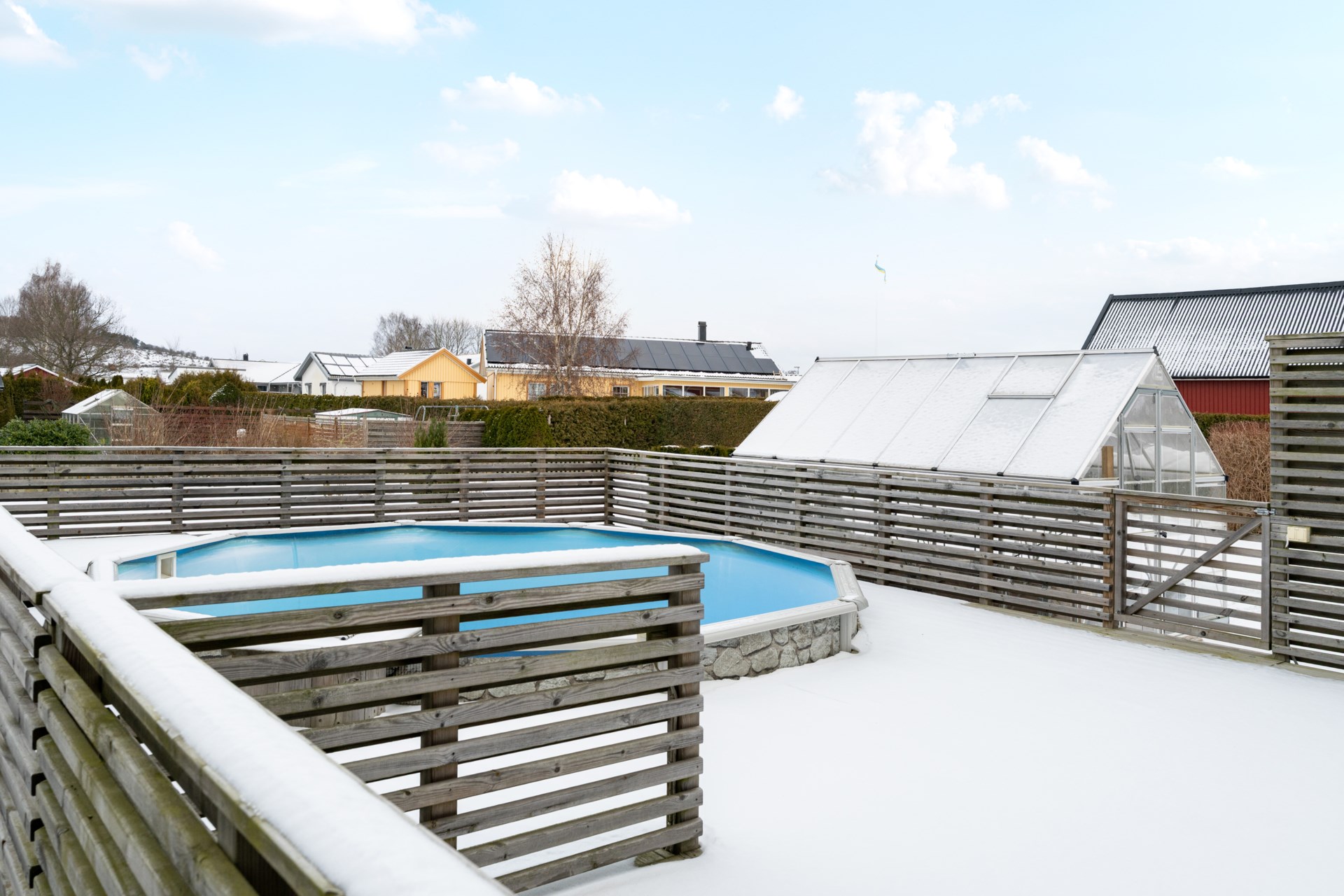På husets baksida väntar en privat och insynsskyddad oas. Det stora trädäcket med pool bjuder in till lata sommardagar, grillkvällar och härliga stunder med familj och vänner. För den odlingsintresserade finns en väl tilltagen trädgård med stora möjligheter samt ett växthus som förlänger odlingssäsongen ytterligare.