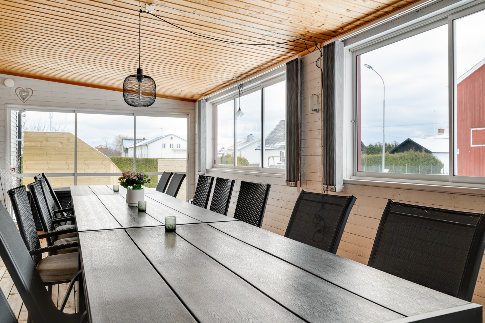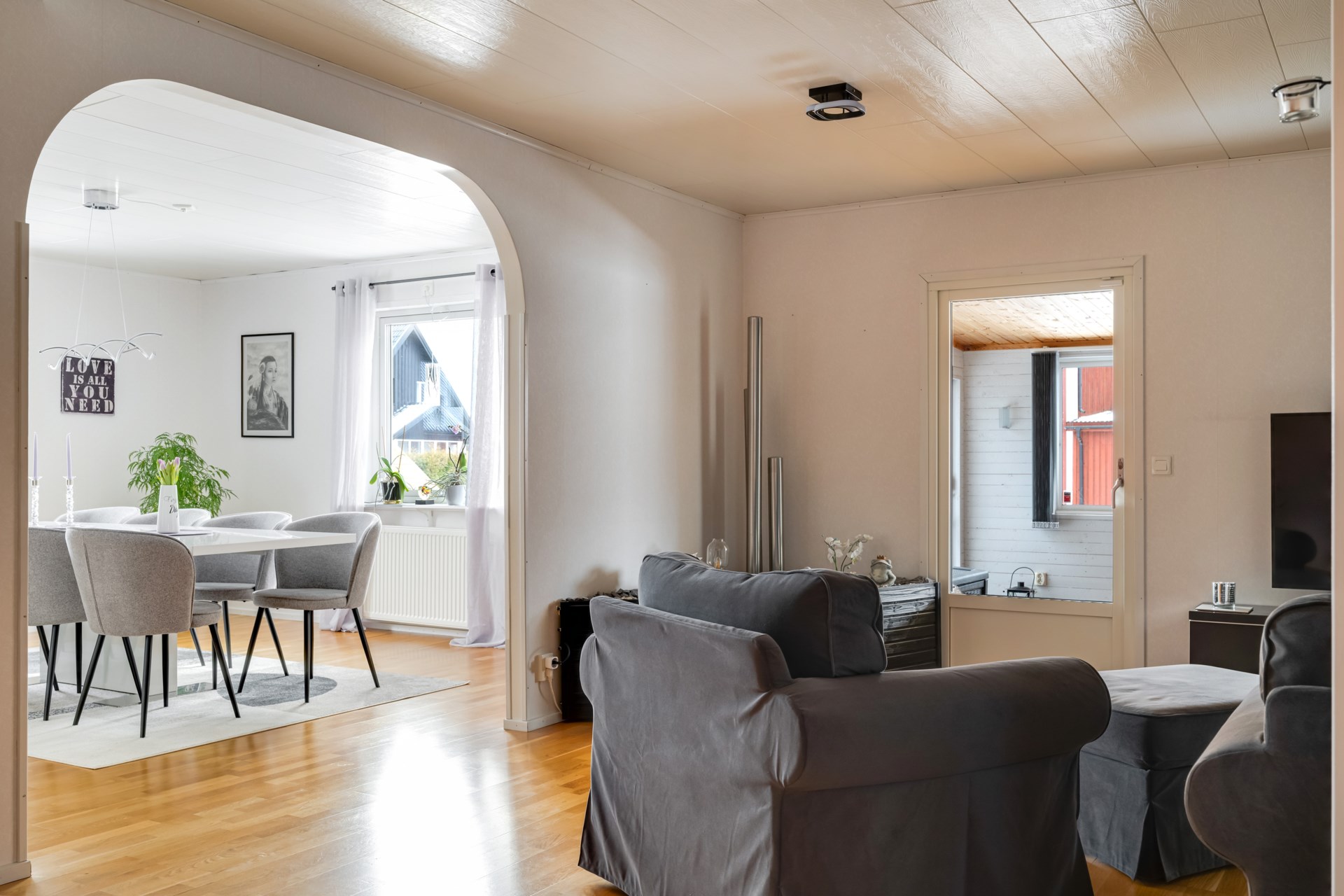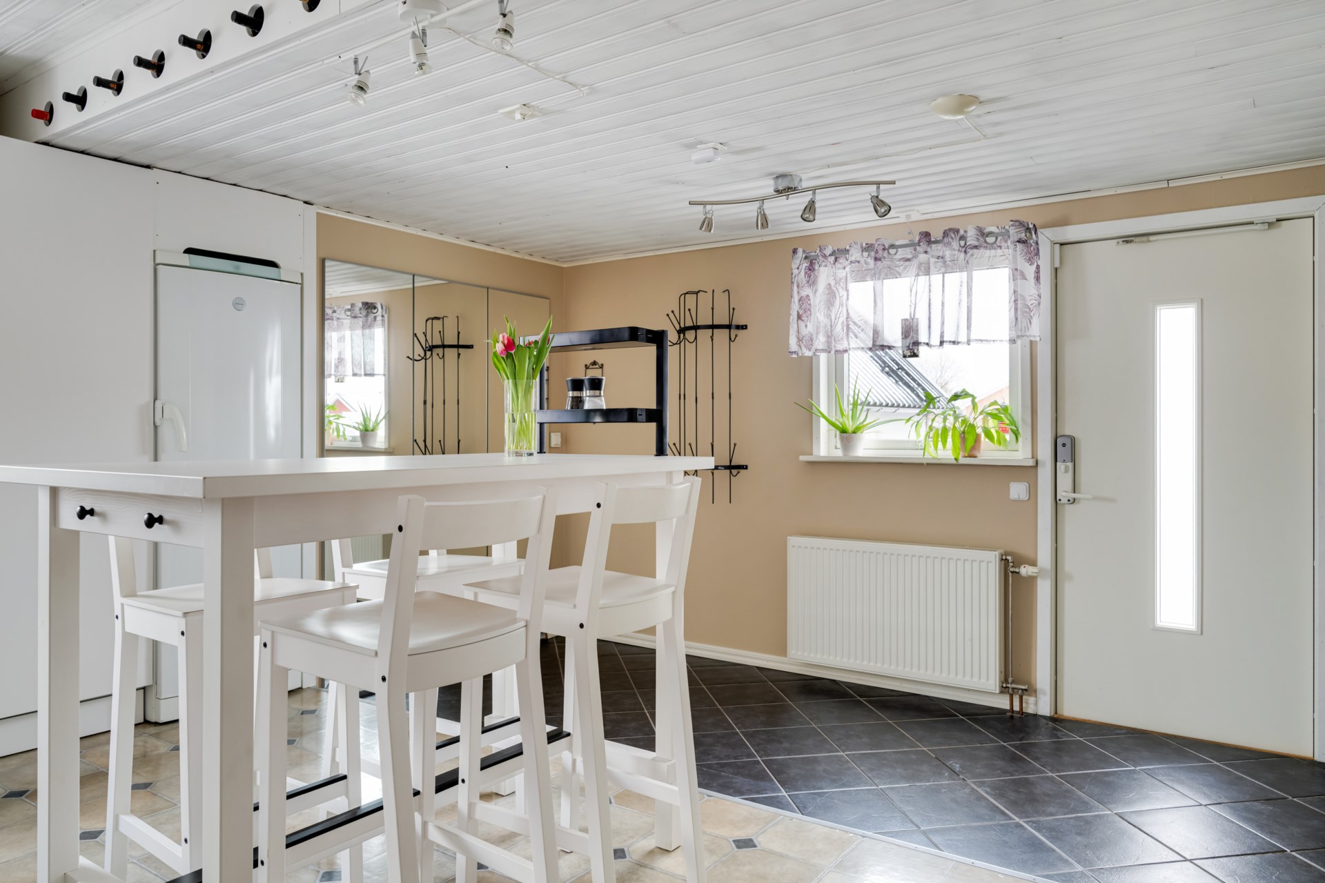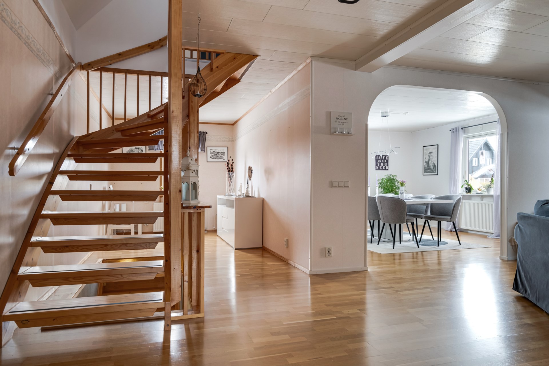 Invändigt möts du av en välkomnande hall som leder vidare till ett stort och smakfullt kök som renoverades 2025 med bland annat nya luckor, bänkskiva och kakel. Här finns gott om både förvaring och arbetsytor – ett kök att trivas i. Vidare öppnar sig ett generöst allrum med plats för både vardag och fest, samt utgång till ett stort uterum där du kan njuta från tidig vår till sen höst. På entréplanet finns även ett större matrum samt ett rymligt badrum med kakel och klinker, hörnbadkar, dusch och behaglig golvvärme.