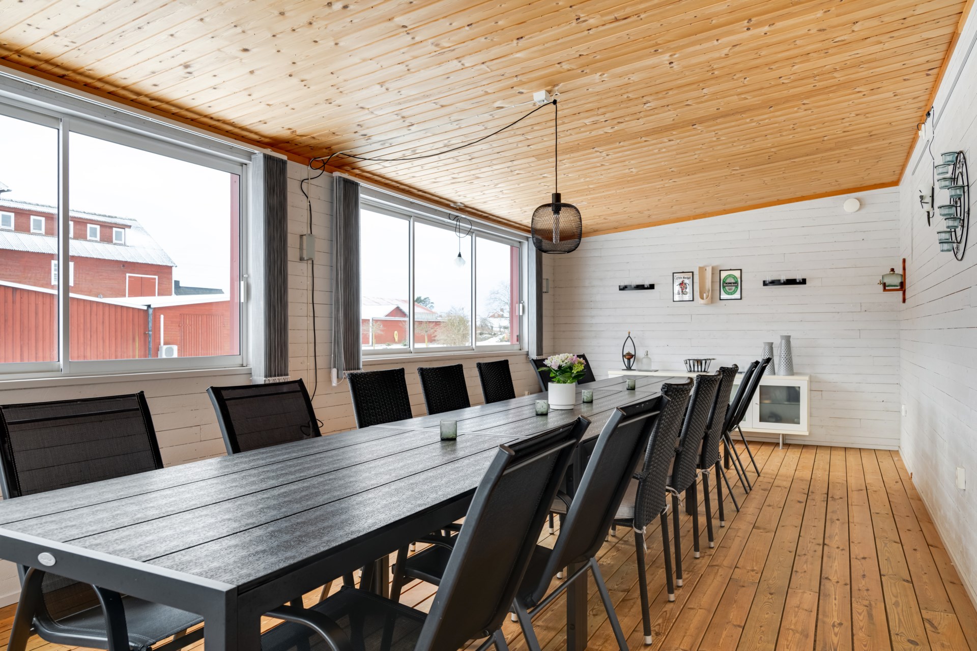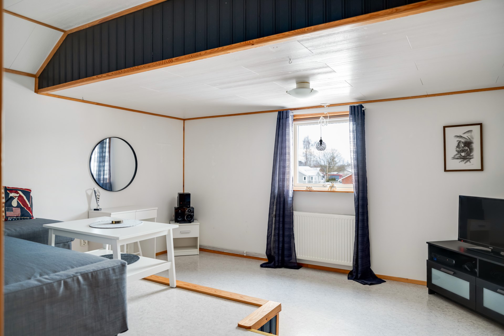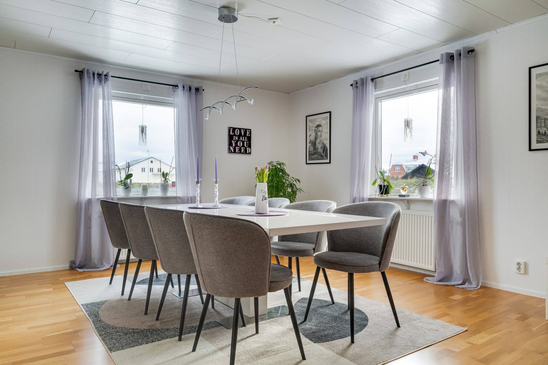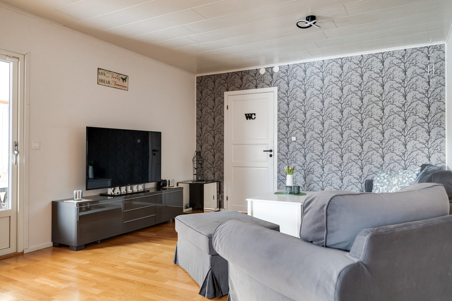 Invändigt möts du av en välkomnande hall som leder vidare till ett stort och smakfullt kök som renoverades 2025 med bland annat nya luckor, bänkskiva och kakel. Här finns gott om både förvaring och arbetsytor – ett kök att trivas i. Vidare öppnar sig ett generöst allrum med plats för både vardag och fest, samt utgång till ett stort uterum där du kan njuta från tidig vår till sen höst. På entréplanet finns även ett större matrum samt ett rymligt badrum med kakel och klinker, hörnbadkar, dusch och behaglig golvvärme.