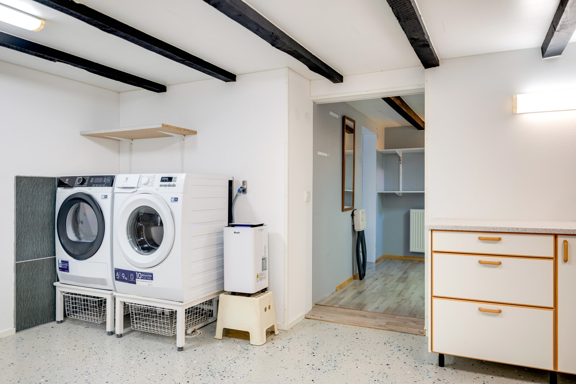 Källaren erbjuder gott om förvaringsutrymmen samt en stor och praktisk tvättstuga utrustad med tvättmaskin, torktumlare och generösa ytor för torkning.